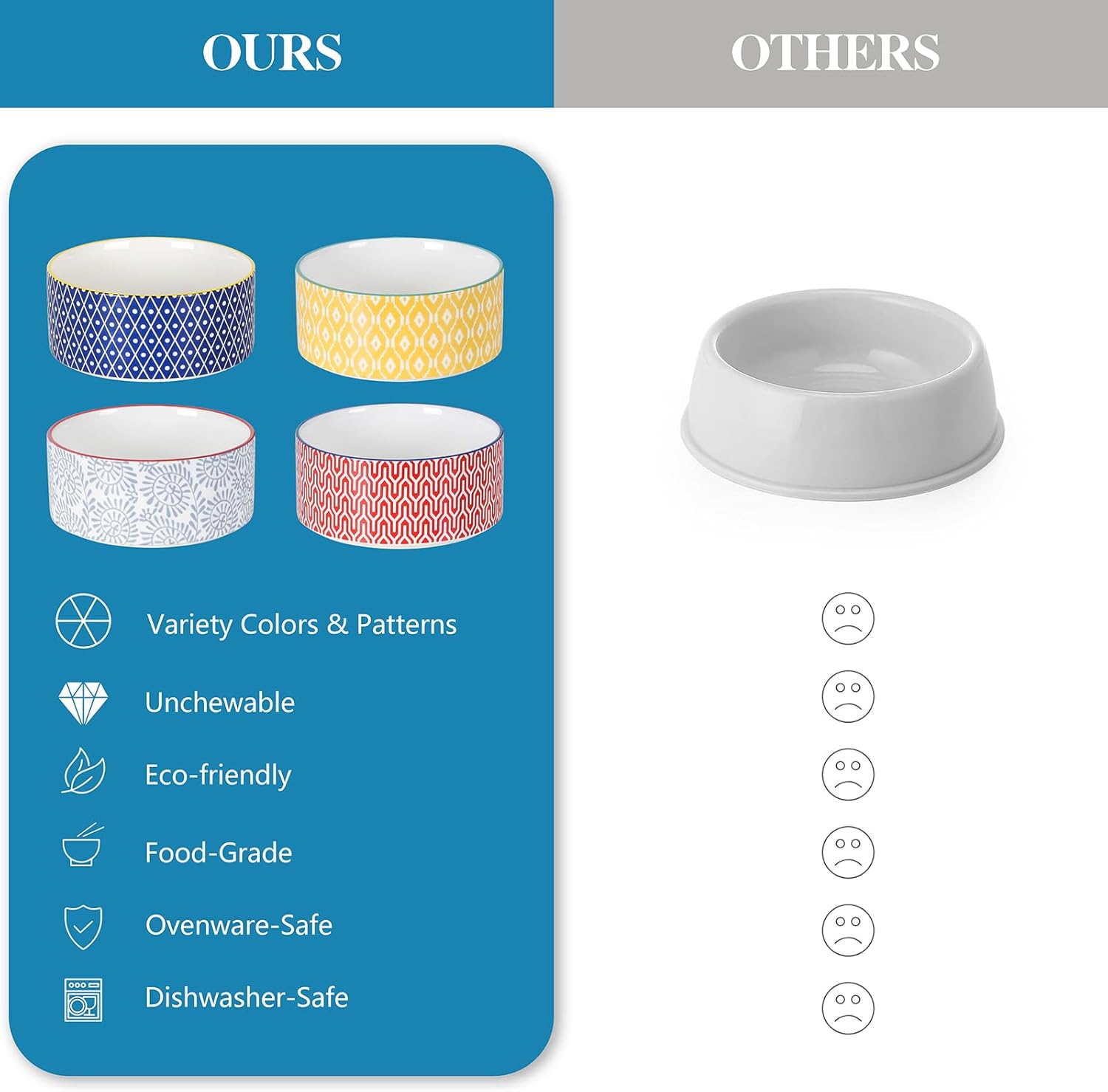 • HEALTHY STURDY CERAMIC MATERIAL - Our dog food dishes are made of premium ceramic material, which has no harmful lead & cadmium, odorless, sturdy, and healthy for your furry friends. And the ceramic pet bowl helps your dog away from chin disease. Its smooth glaze finish makes it wash by hand or dishwasher easily. You can also heat the food in the microwave for your pets at any time.