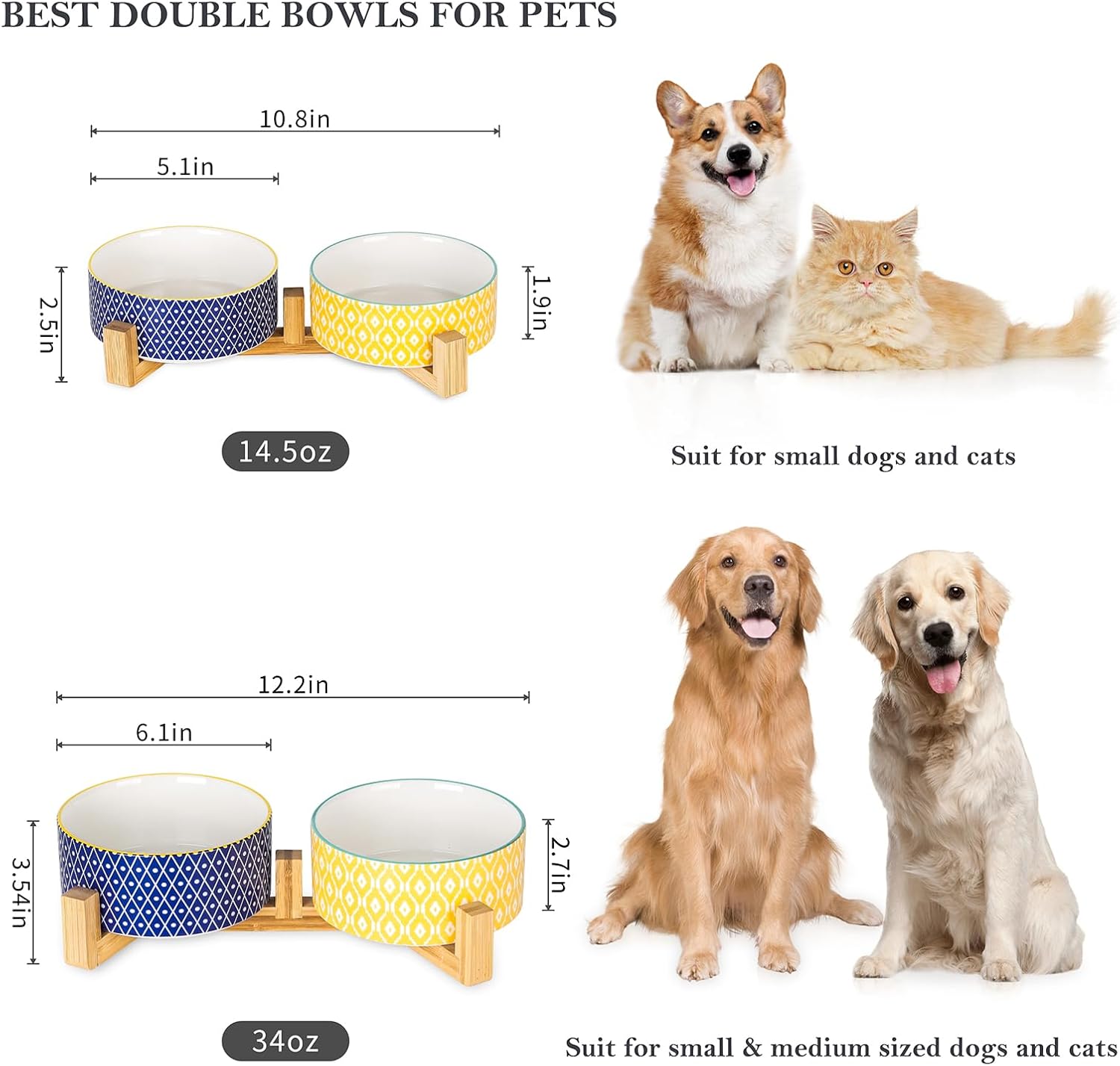 • DOUBLE BOWLS, DELICATE DESIGN - The thoughtful design of these double bowls offers convenience for your pets. You can use one bowl for food and another one for water, raising the dishes closer to your pet for more comfortable eating. Decorated with colored flowers and geometric patterns, these make them more unique that fit perfectly with any home decor style.