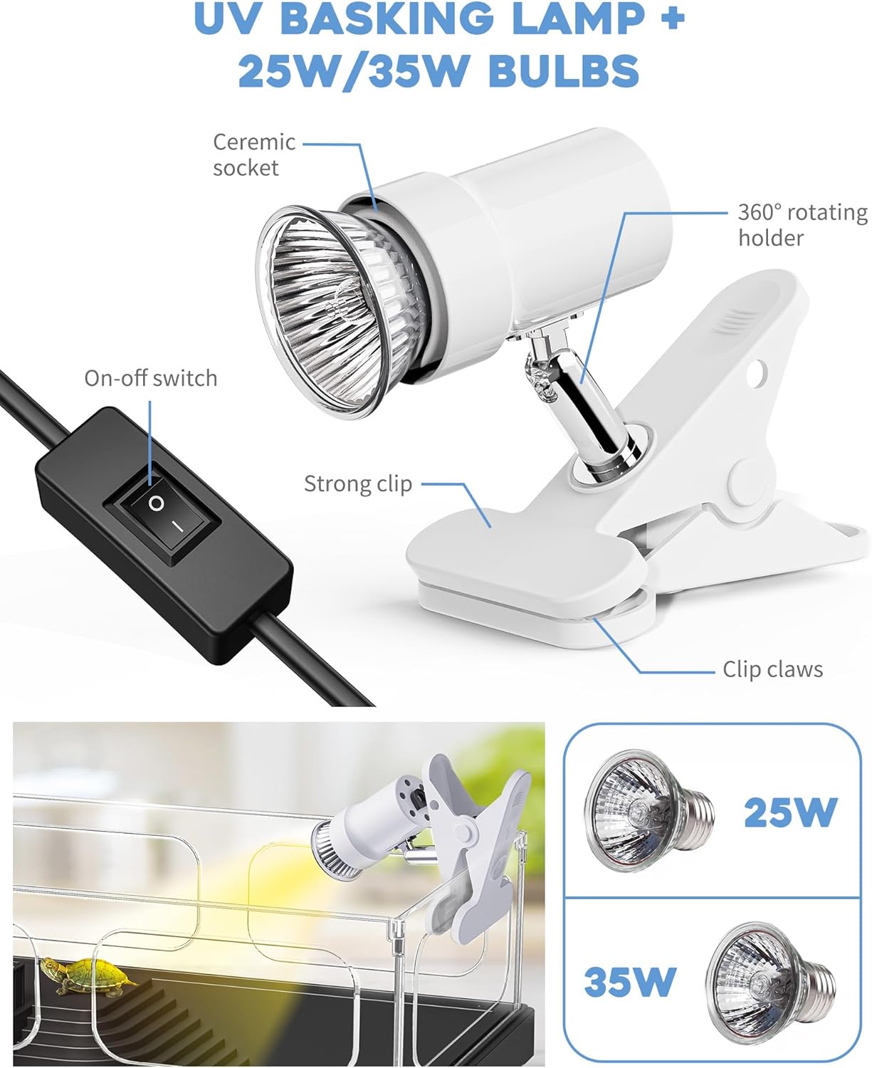 - ใUVA/UVB Basking Lamp + 25W/35W BulbsใTurtles need to bask in the sunshine everyday 1-2 hours for metabolism, mood regulation, breeding, etc. 25W/35W Bulbs provide best warmth within distance of 10โโ to 15โโ. Theyโre perfect for this small tank, not too hot not too cold.