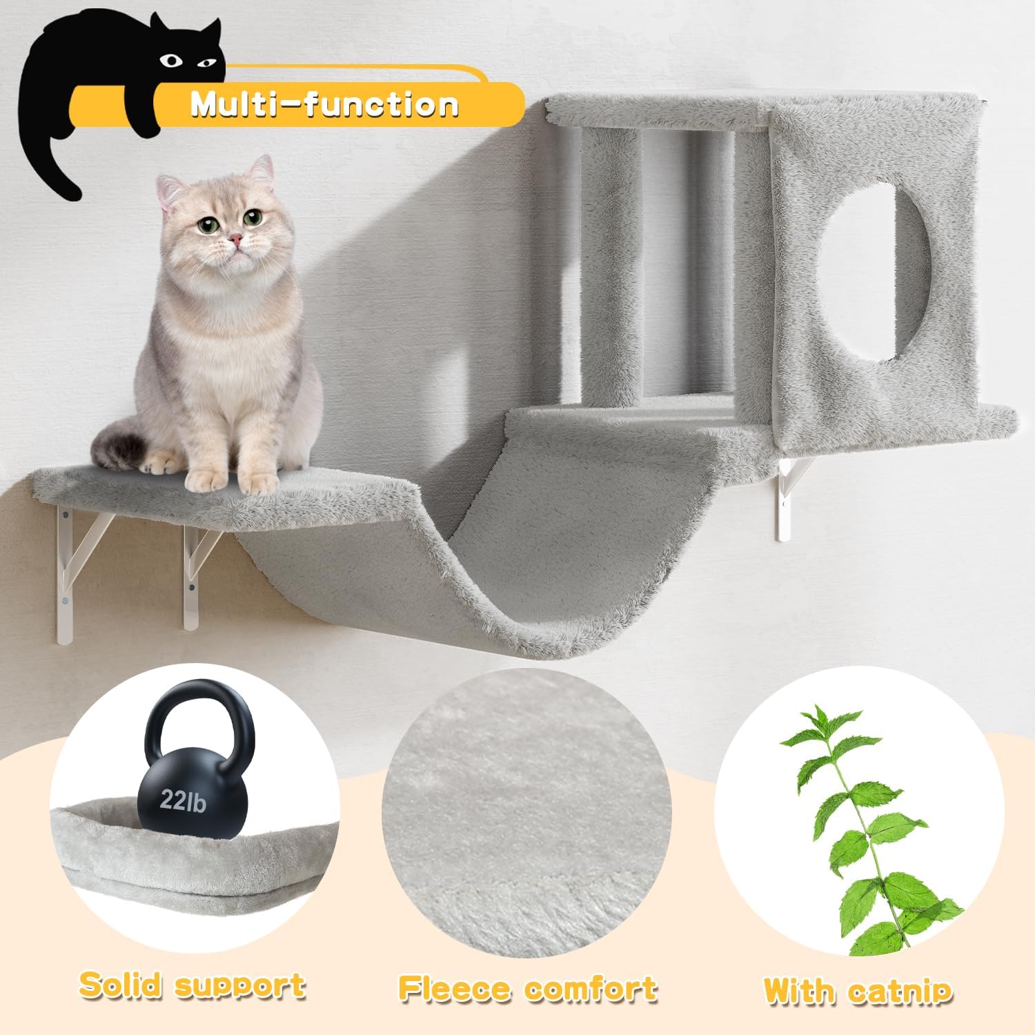 • NATURAL MATERIALS, COMFORTABLE AND SAFE - Safe material and sturdy, the surface of the cat furniture is smooth and burr-free, won't hurt your beloved cat. Soft plush fabric cover, increase your pet's comfort. After our test, this cat climbing frame can hold up to 22lbs, more suitable for kittens and underage cats weighing up to 22lbs.