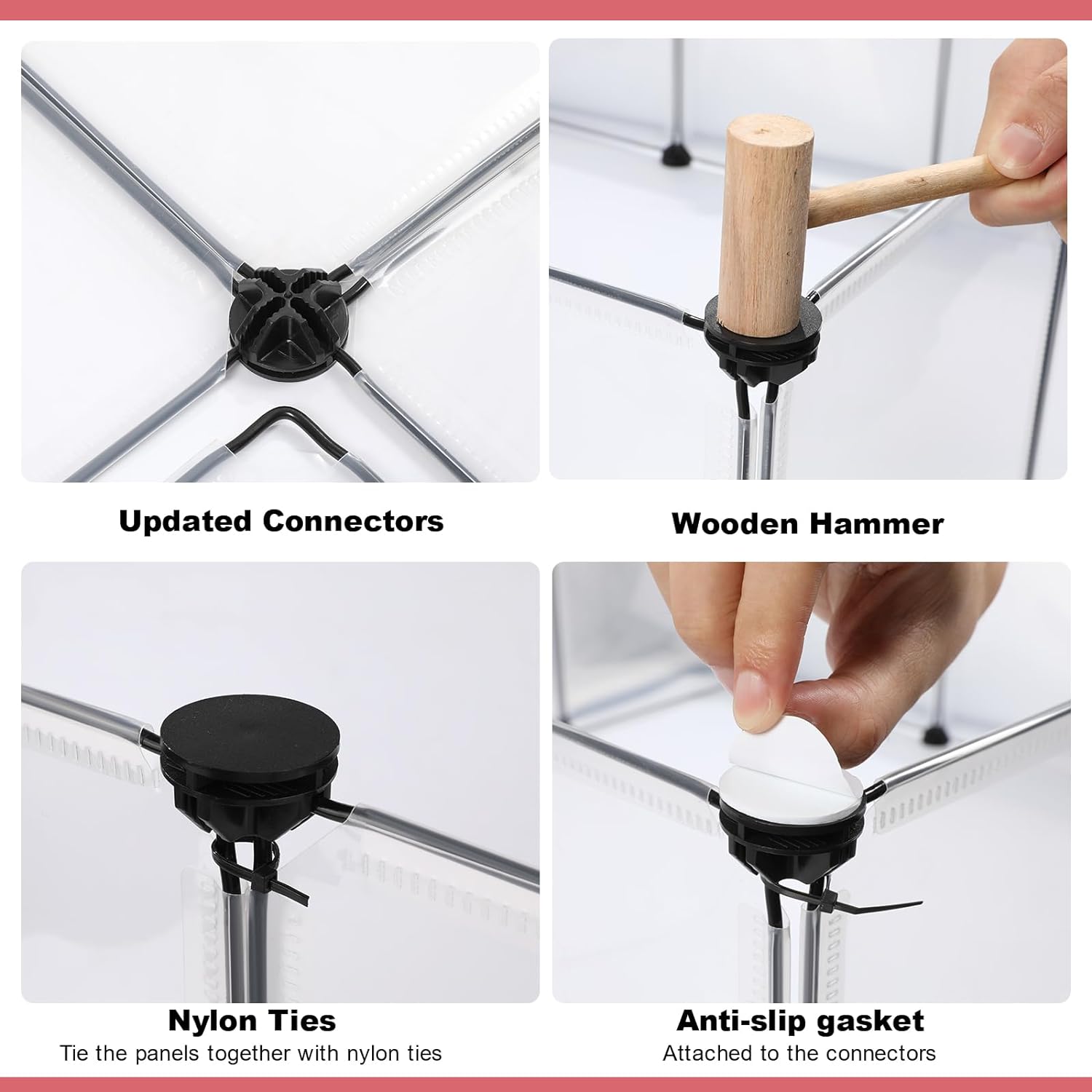 • [Pet Playpen Package]: Each set includes 12pcs transparent panels, 50pcs nylon cables, 24pcs connectors,12pcs non-slip mats,1pc wooden hammer, 1pc User manual. This small animal playpen offers a spacious and secure area for your furry friends to play and exercise. Assembled size can be 48" x 24" x 16".