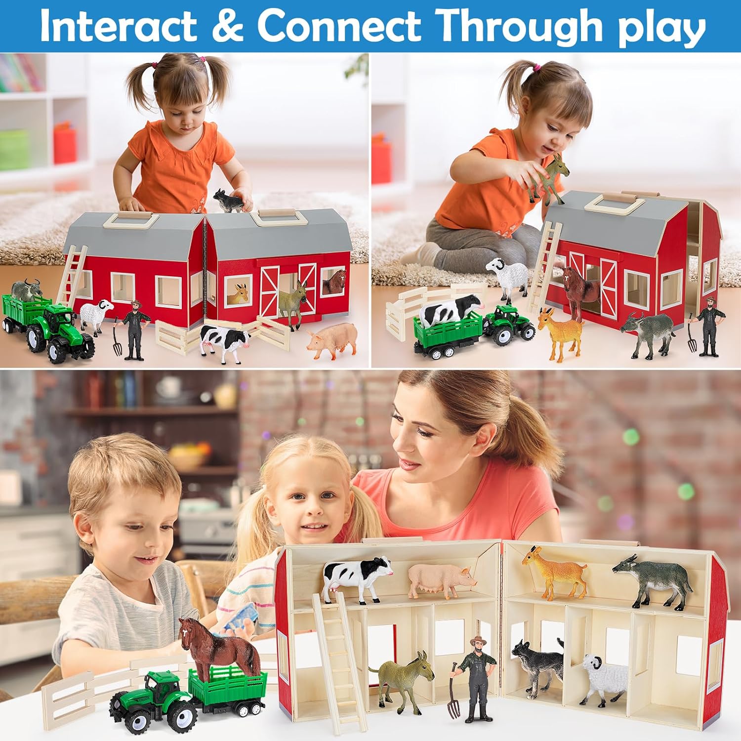 - Fun & Educational Farm Playset: Package includes 1 wooden portable red barn, 10 farm play figurines, 1 wooden ladder, and 1 folding corral. These farm animals with realistic and cute designs are perfect for screen-free play and for introducing preschool kids ages 3 years to animal facts. Great for parent-child interaction and kindergarten preschool learning activities.