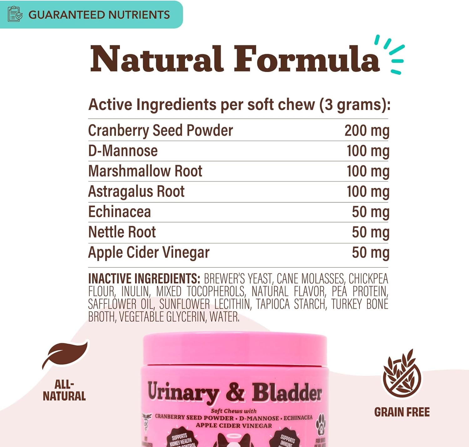 - OPTIMAL BLADDER HEALTH: Ensure your petโs comfort and happiness with our Urinary and Bladder Soft Chews. These chews provide superior bladder control for dogs and support the entire urinary tract for dogs, helping to reduce discomfort and improve daily life. Trust in our natural formula to keep your dog's bladder health in check and their spirits high.