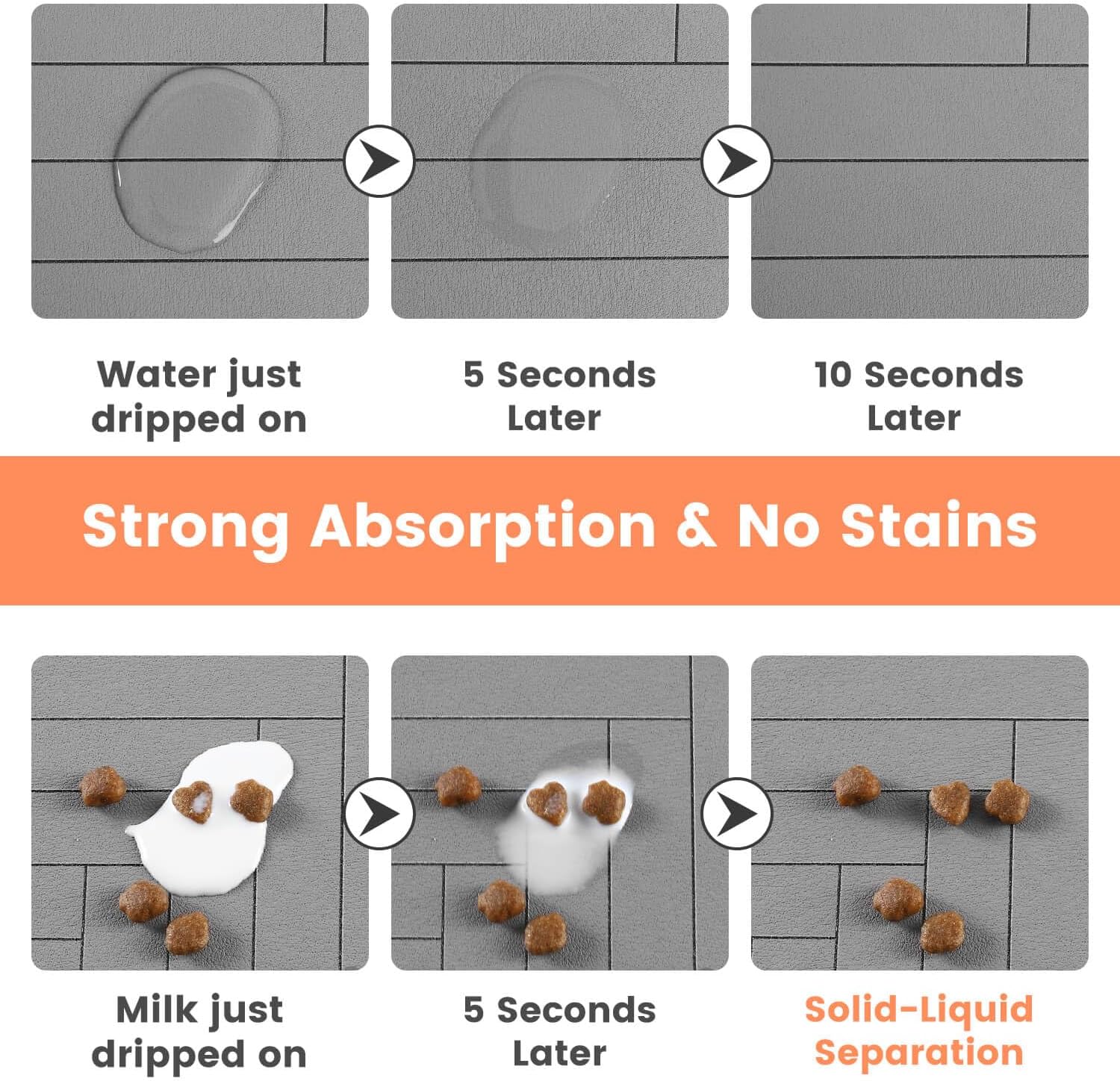 • 【Strong Absorbent & Stain-Resistant】Our dog food mat boasts exceptional absorbency, quickly soaking up any spilled water & milk and leaving no traces behind. It effectively prevents wet paws and keeps your pet's eating area clean.