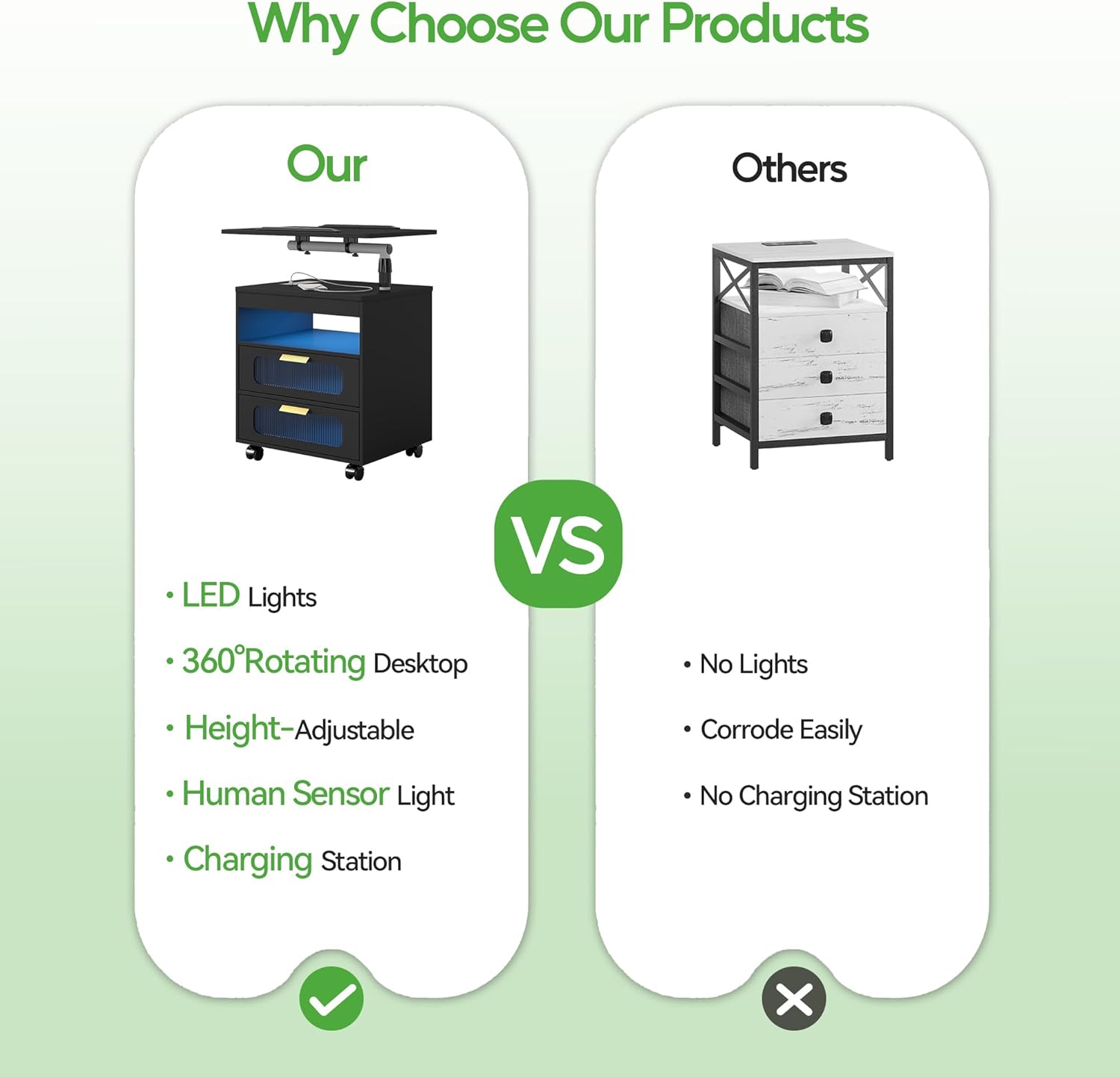 HNEBC Nightstand with Wireless Charging Station, LED Nightstand Has Adjustable Rotary Workstation,Smart Night Stand with 2 Drawers,Modern Bedside Table for Bedroom, Sensor Light/Wheel (Black)