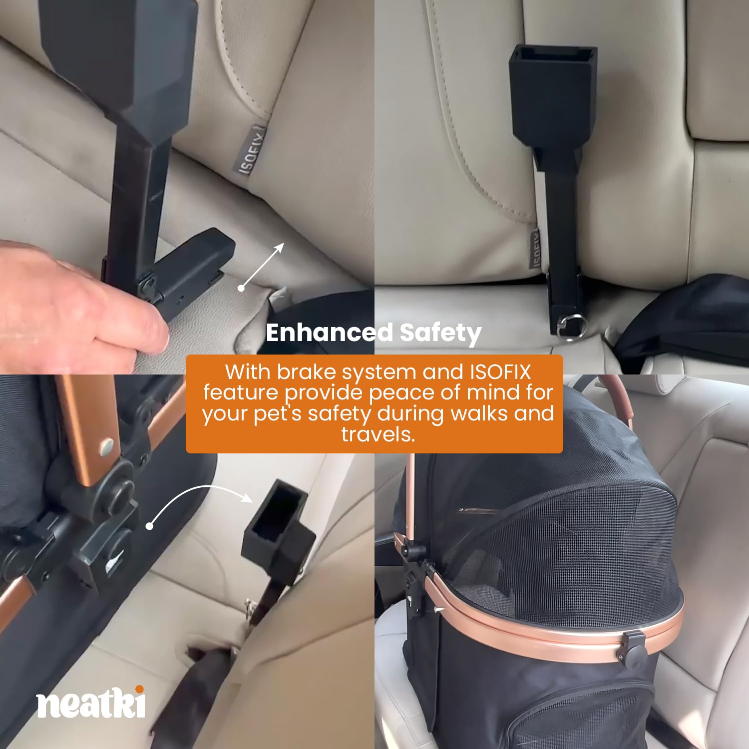 • Enhanced Safety – Equipped with a reliable brake system, this stroller keeps your pet secure and gives you peace of mind during walks and outings. Now featuring ISOFIX for easy vehicle installation, ensuring a safer, stress-free travels with your furry friend.