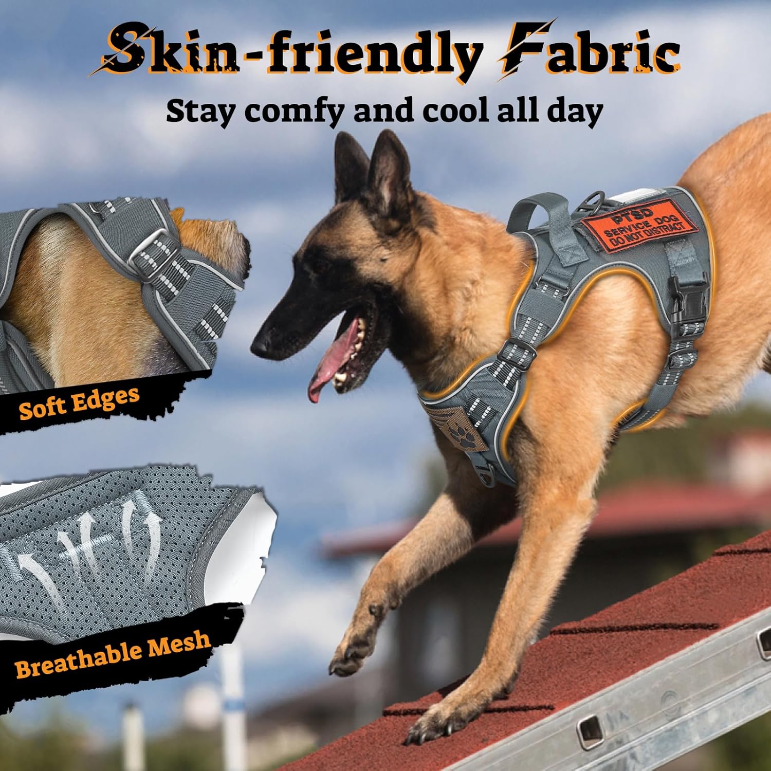 • No-Pull and Control: The harness has 19 leash attachment clips, including a metal front clip for no-pull running and a daily back clip for casual jogging. The large padded handle offers comfortable real-time control in an emergency