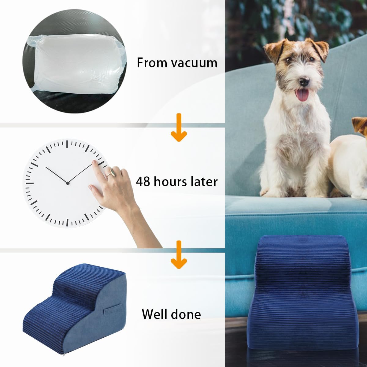 • [ Special Attention Notes ] --- Our pet stairs are adopts vacuum compression packing, after unpacking, the foam will slowly rebound to its normal size, generally, it will take about 24-48 hours to rebound to the largest size. Please note that the foam is not washable.