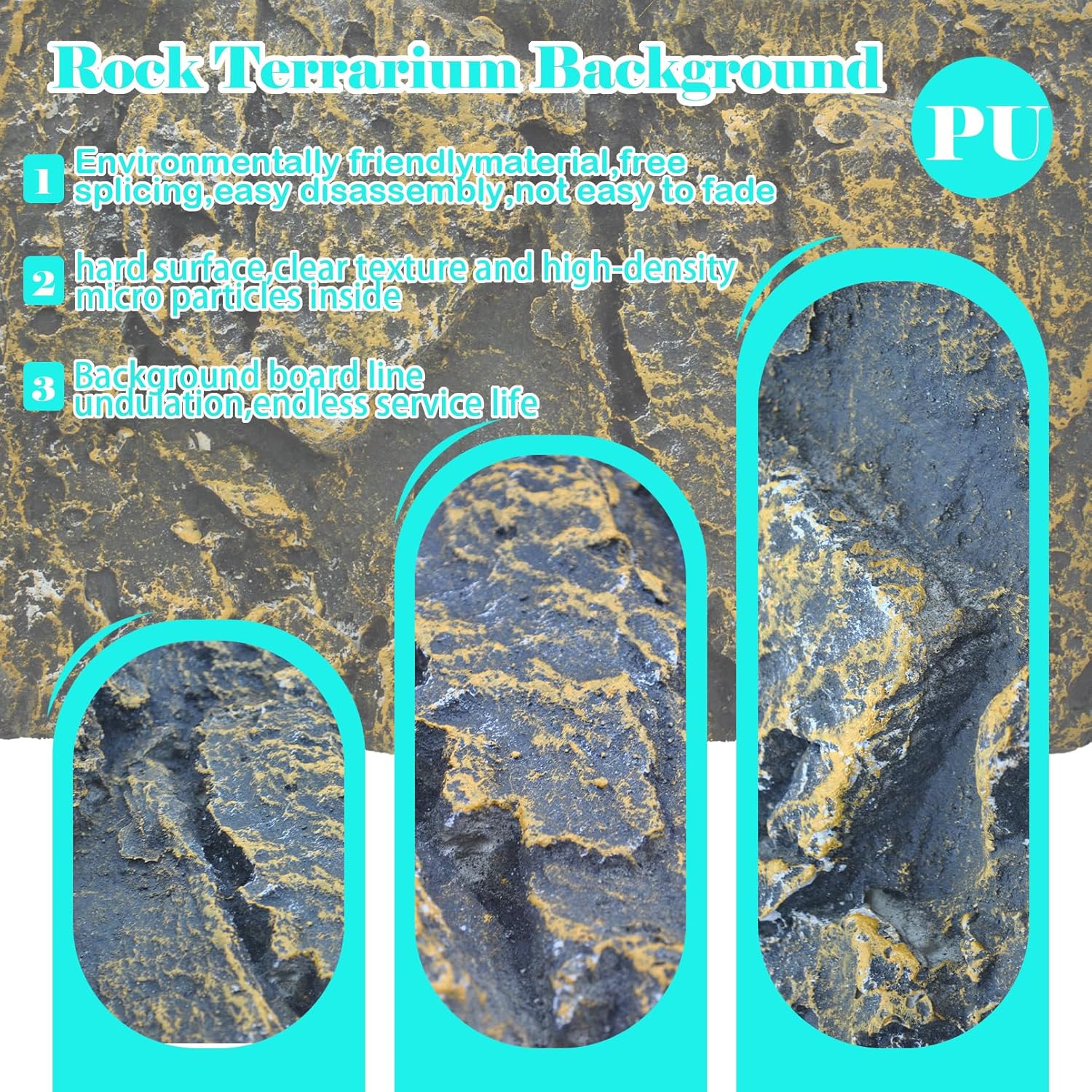 • High Quality Material:Reptile tank background is made of PU material, hard surface,clear texture and high-density micro particles inside,has high simulation and durability,and does not affect the PH value,high hardness natural stone patterns,background board line undulation,endless service life,rock terrarium background no toxic and harmless,environmentally friendly material,free splicing,easy disassembly,not easy to fade,uneven surface and fine texture,suitable natural habitat for any reptile