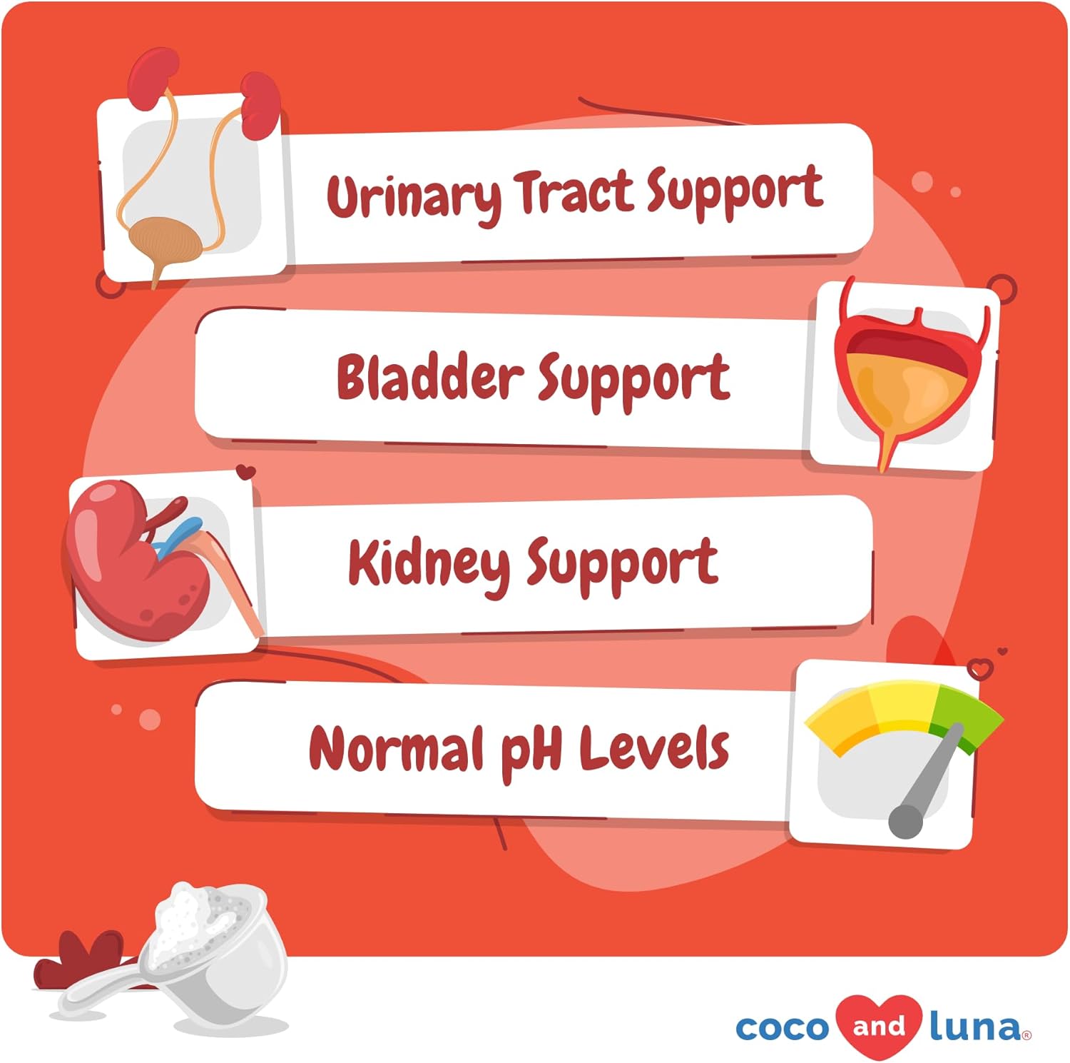 • Natural Urinary Tract Support - Coco and Luna Urinary Tract Support is a natural supplement that contains Cranberries which help soothe any discomfort in the urinary tract.