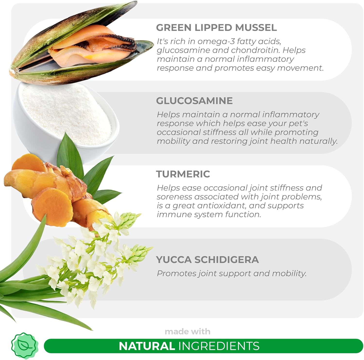 • Advanced Joint Health Formula: Our hip and joint support product for dogs combines powerful ingredients like Glucosamine, Green Lipped Mussel, and Egg Shell Membrane to maintain a normal inflammatory response, reinvigorate joint health, and promote joint mobility naturally.