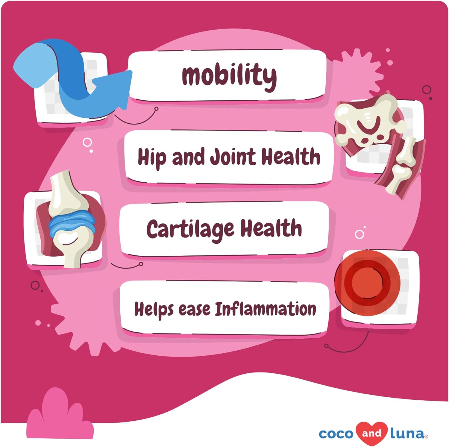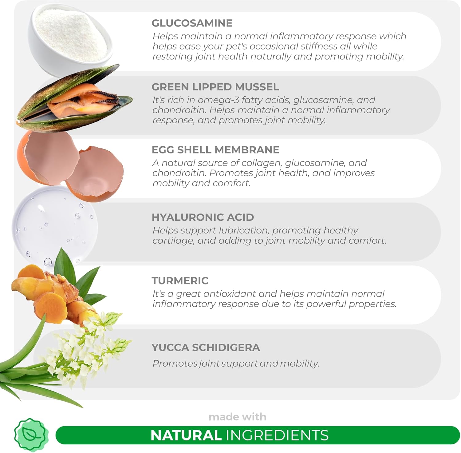 • Advanced Joint Health Formula: Our hip and joint support product for dogs combines powerful ingredients like Glucosamine, Green Lipped Mussel, and Egg Shell Membrane to maintain a normal inflammatory response, revive joint health, and promote joint mobility naturally.