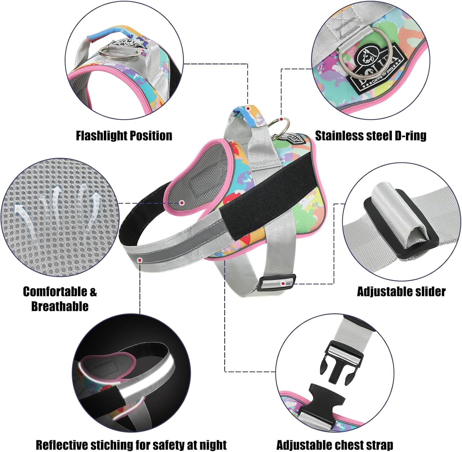• OUTDOOR HEALTHY: Puppy no pull dog harness with reflective straps to ensure your dog is highly visible and keep dogs safe at night. You can connect the dog leash on the D-ring and with handle is easy to control on crowded streets. The high-end pet harness is perfect for daily walking, running, hiking, training, hunting, outdoor adventure and more!