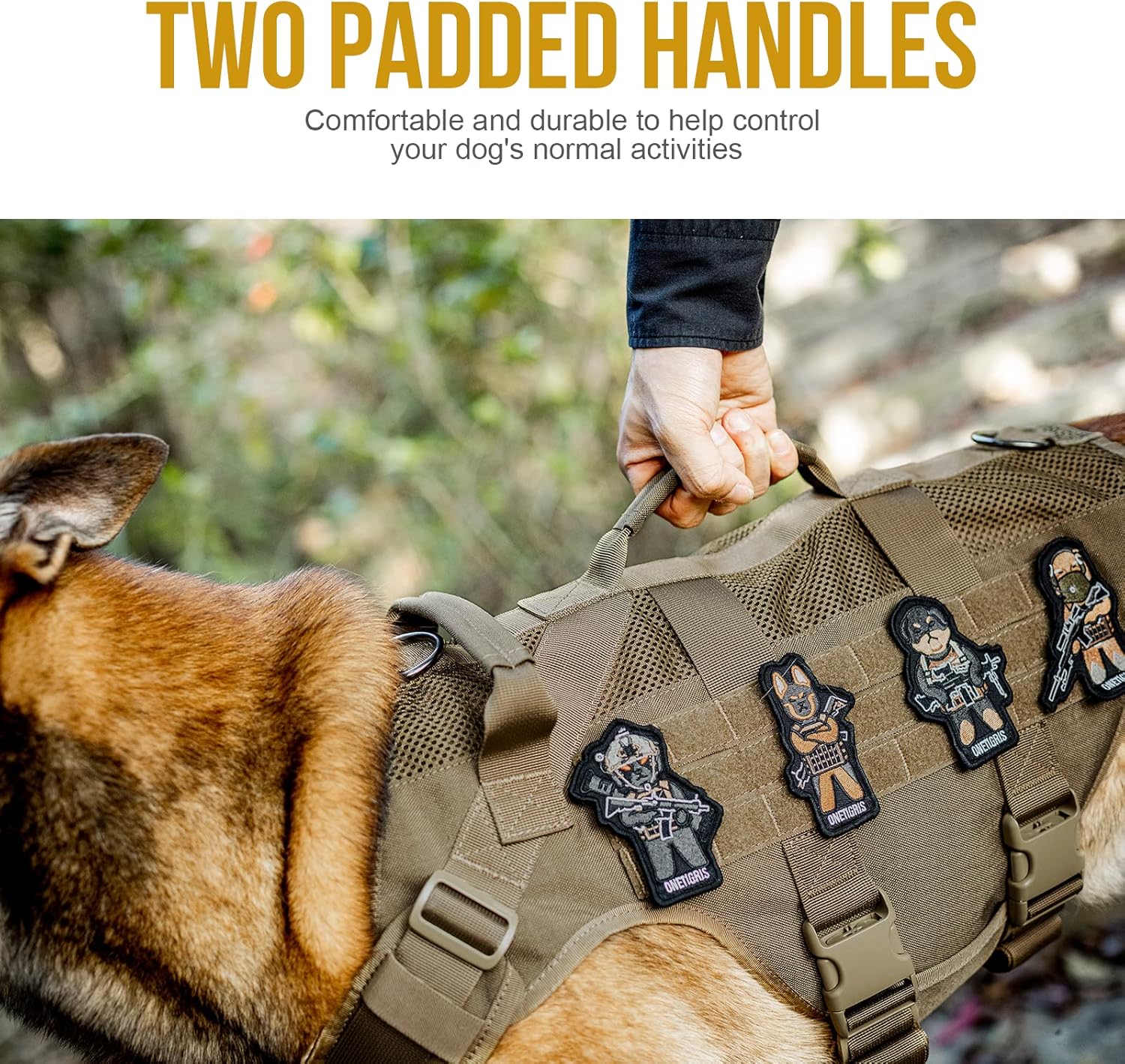 • [Molle/Handles]: Looped MOLLE panel on both sides for MOLLE compatible add-ons such as treat totes, poop bag pouches, service dog kits, military patches and name tags. 2 padded grab handles with reinforced stitchin. Useful for getting in/out of a car, immediate canine control in crowded areas or with other dogs, etc.