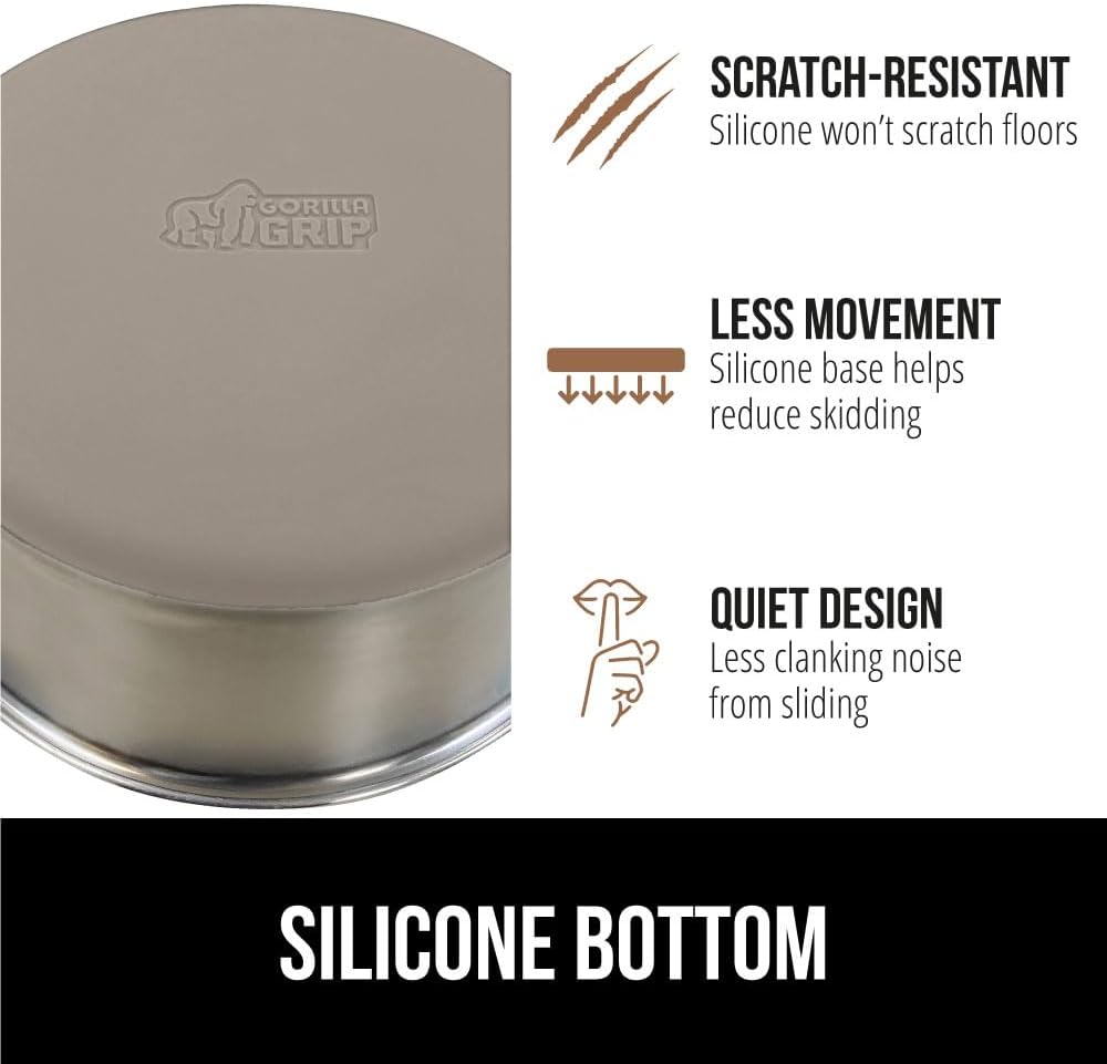 • SILICONE BOTTOM: the Gorilla Grip bowl is constructed from durable silicone that helps keep the bowl steady and wonโ€™t scratch your floors; while some over eager eaters may still be able to slide the bowls, the silicone will help prevent much movement; plus, it reduces the noise from clanking and sliding across wood, tile, and more