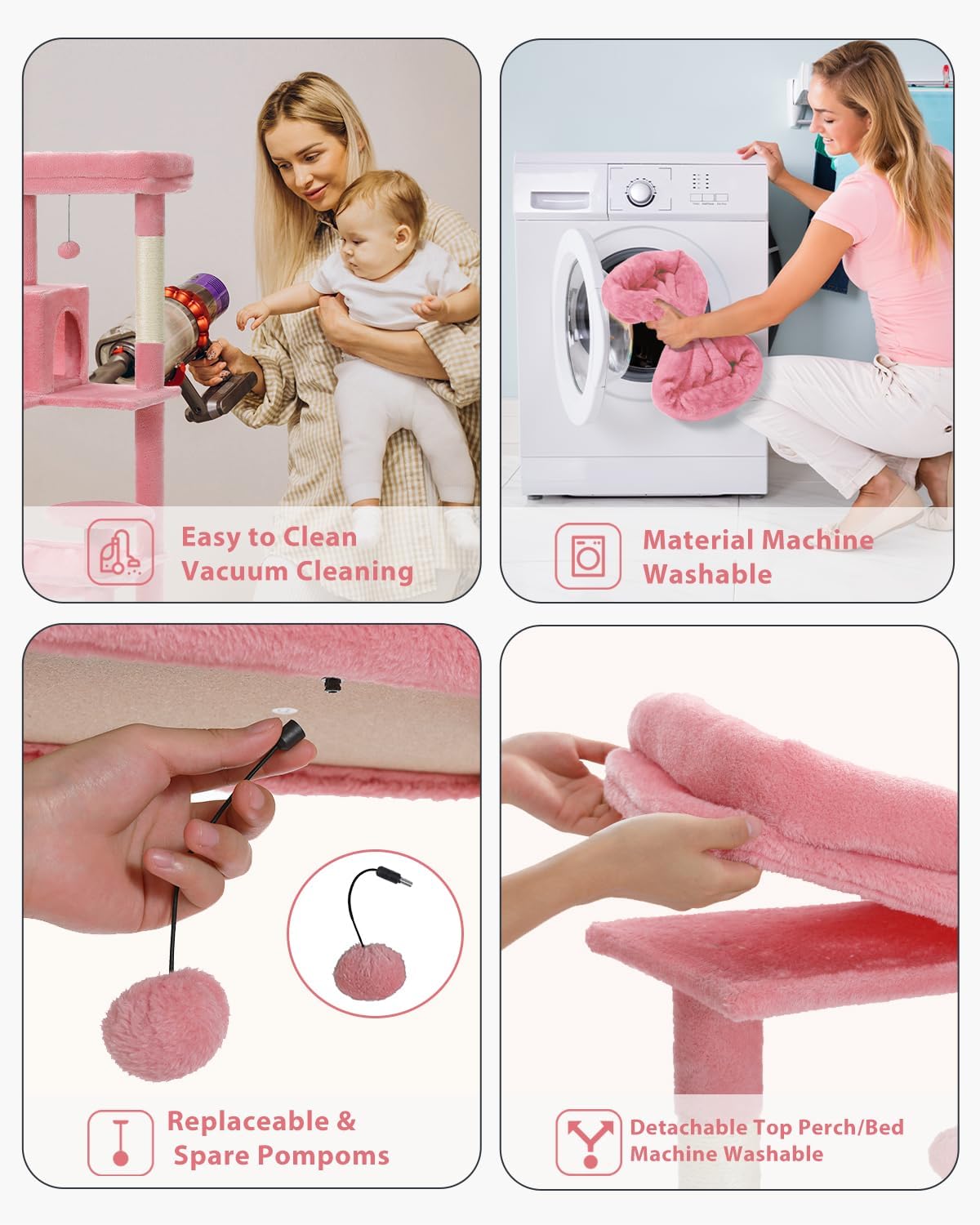 • Easy to clean: The detachable top perch is machine washabled and dried, and the whole cat tree is covered with faux-fur can bed easily cleaned by any vacuum cleanner.