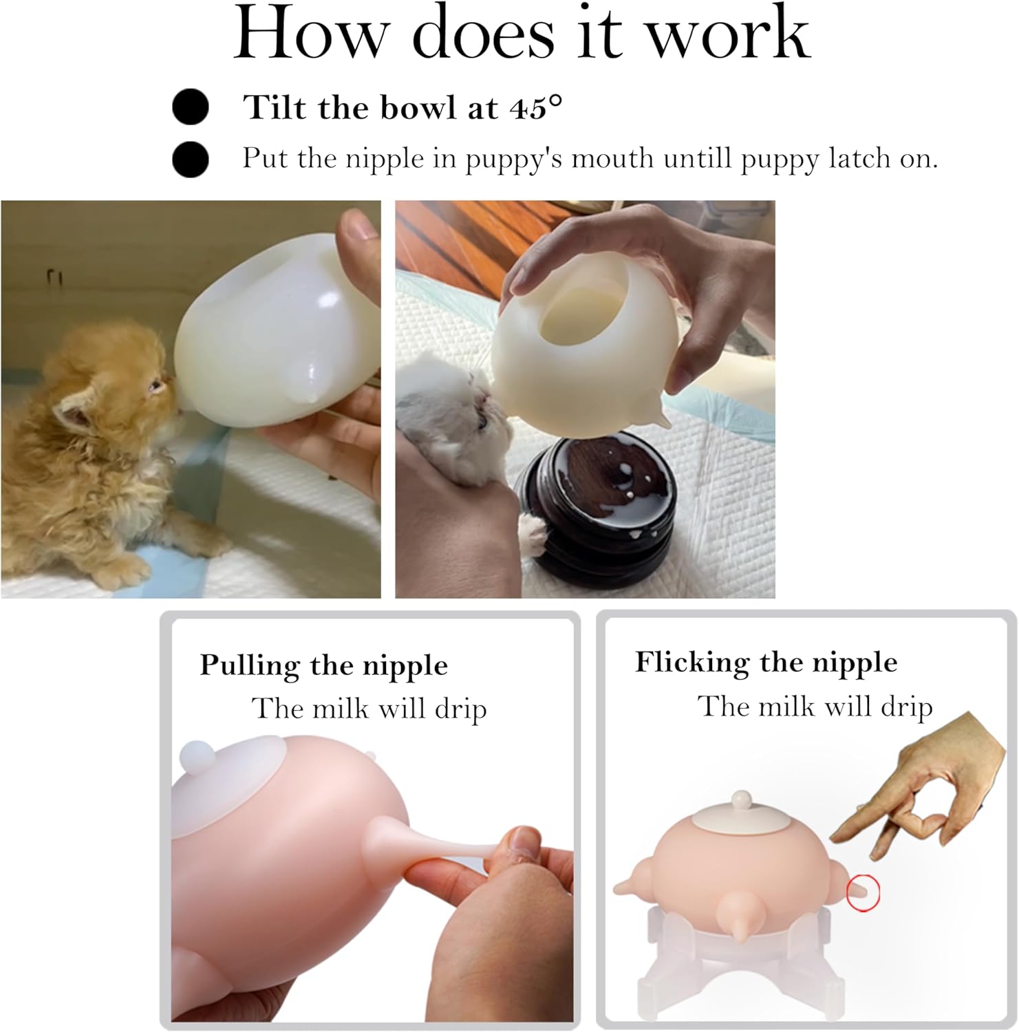- The product must be used under human supervision at all times. Especially when puppies are over 30 days old, it is not recommended to use this product because the nipple is too soft and their sharp teeth have already grown, which may bite off the nipple and pose a risk of ingestion