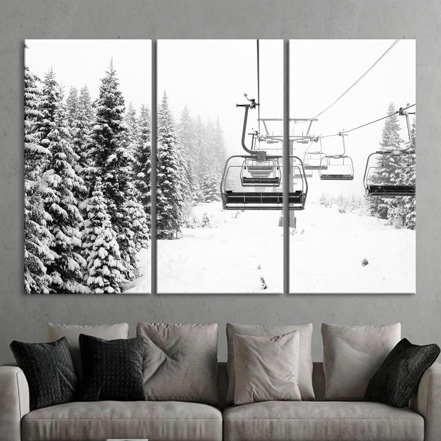 Nature Wall Art Prints - Ocean Forest Mountain Lake Canvas Landscapes - Small to Extra Large Living Room Bedroom Kitchen Bathroom Décor (Ski Lift on Snowy Mountain, 55L" x 83W"- 3 Panels)