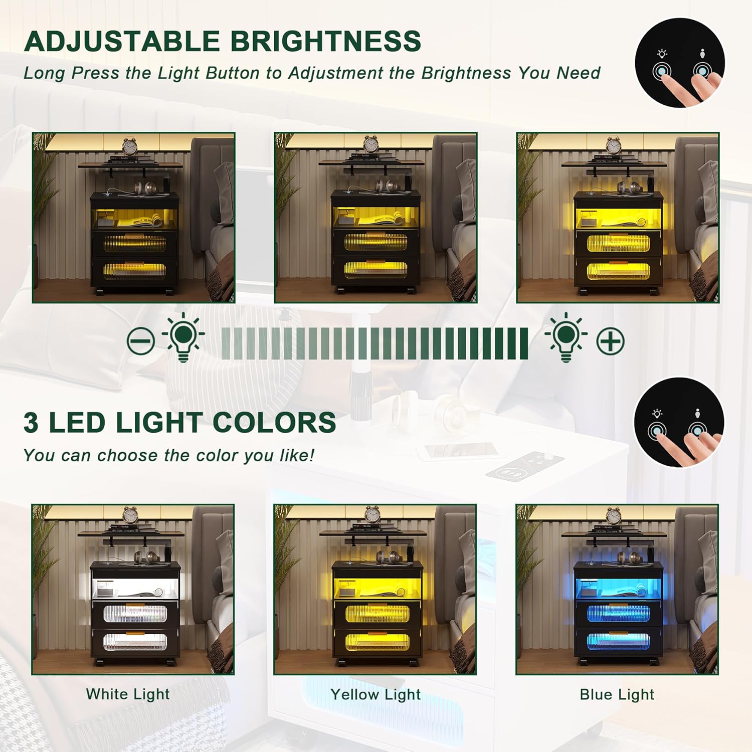 • ✅【Large Capacity Space】 The led nightstand provides spacious storage for nighttime essentials. There is a swivel desk; Open storage shelves; 2 drawers,The desktop can hold everyday items and keep them within reach.