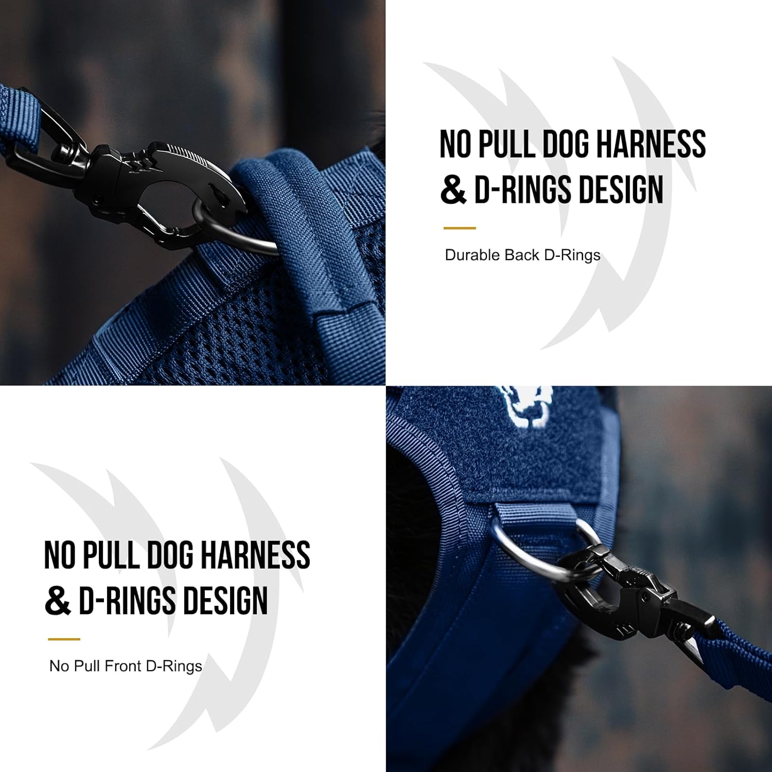 • [No Pull D-ring]: 3 stainless steel D-rings at the front chest and back for training, short and long leashes, with 4 UTX-Duraflex quick-release buckles and 6 fully adjustable straps.