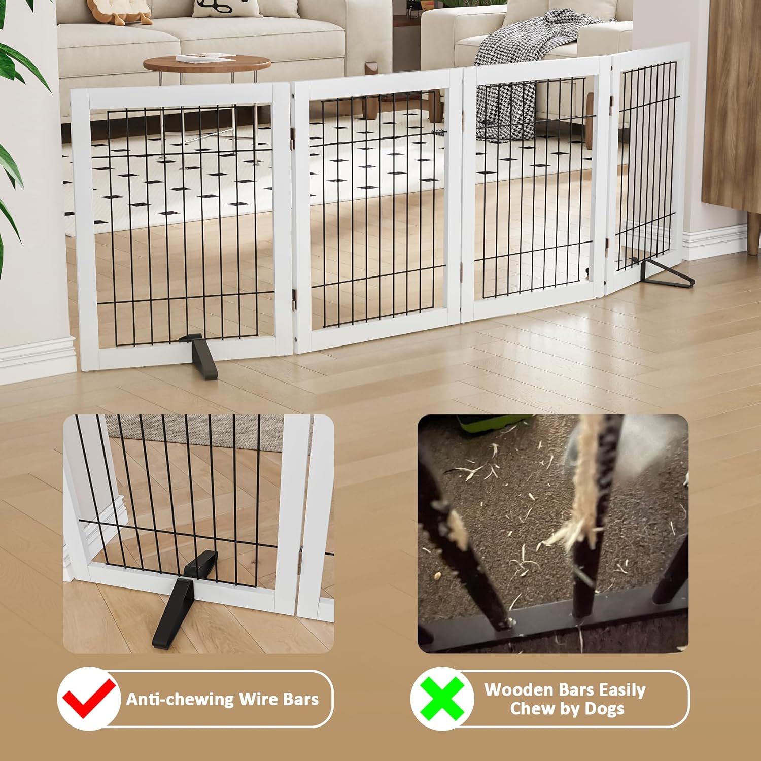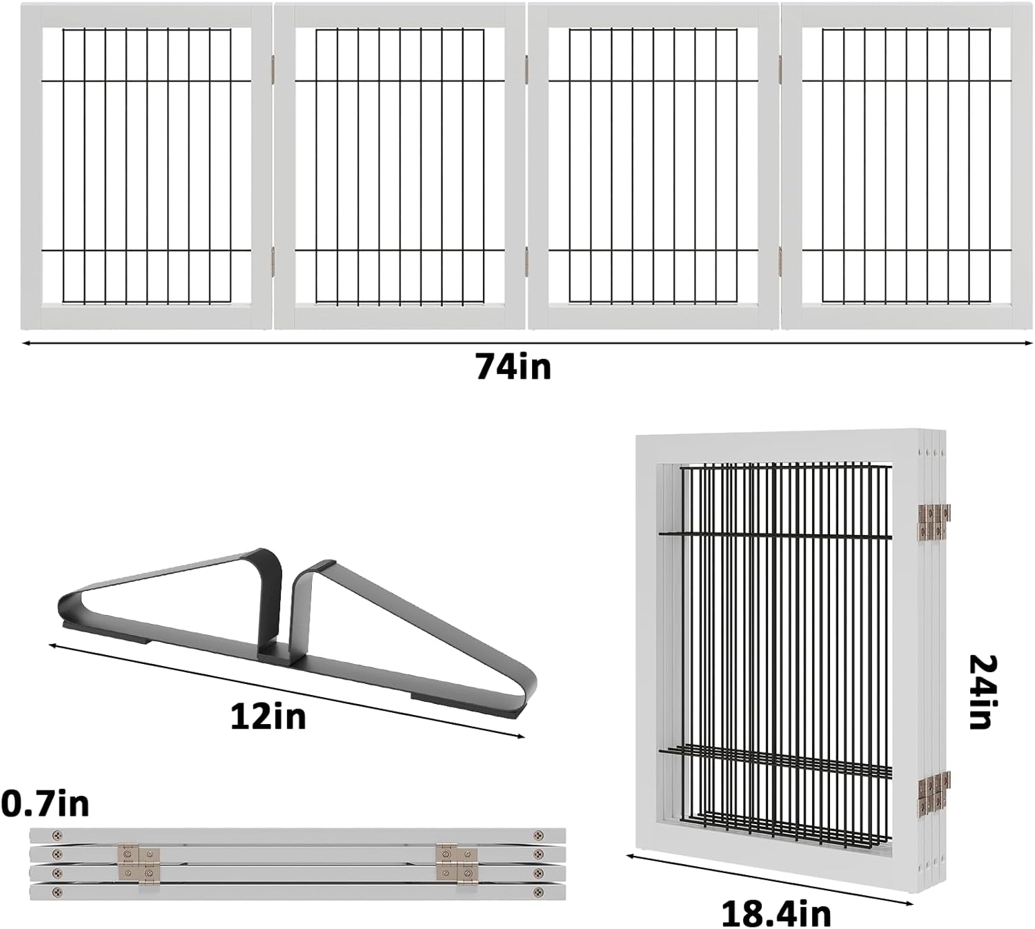 • [Strong and Durable] The sturdy dog gate is made of MDF wooden, can use indoor: hallways, porches, room openings, corner, etc. our wire dog gates are designed with a durable metal fence for added weight and stability,4 panel gate weight 15lb, 3 panel gate weight 11.2 lb. Attached gate bottom rubber dots also help increase frictional force