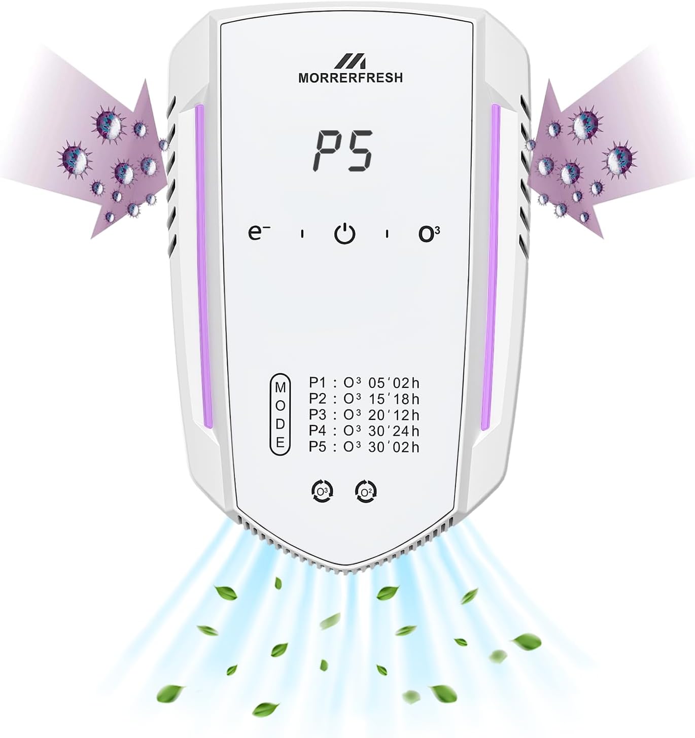 • 5 Adjustable Modes: P1: 5 min ozone, 2-hr pause (50โ€“100 sq. ft.) โ”‚ P2: 15 min, 8-hr pause (100โ€“150 sq. ft.) โ”‚ P3: 20 min, 12-hr pause (150โ€“200 sq. ft.) โ”‚ P4: 30 min, 24-hr pause (200โ€“250 sq. ft.) โ”‚ P5: 30 min, 2-hr pause (over 250 sq. ft. or for rapid deodorizing). Tip: If new odors appear during pauses (e.g., cat litter odor), use P5 for the shortest pause time