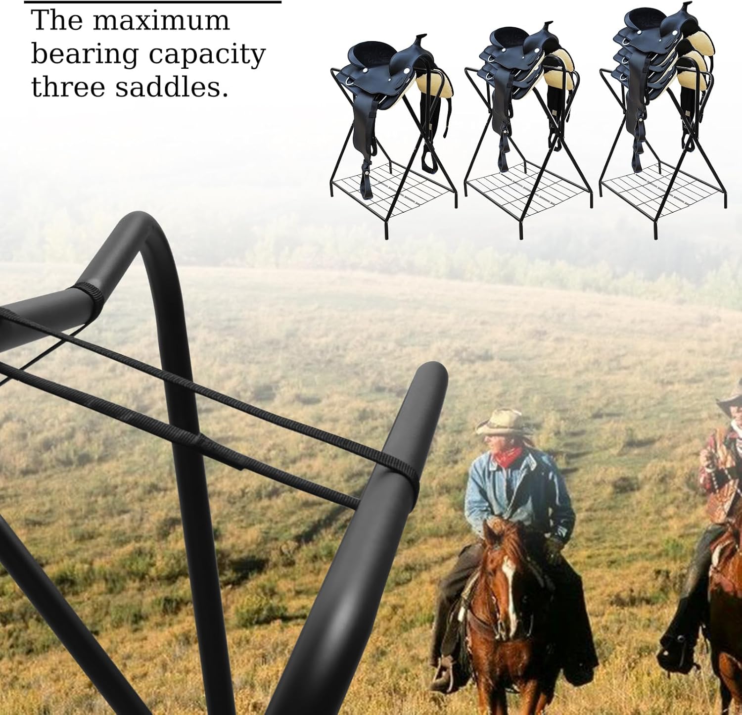 • Portable Design : Horse Saddle Storage Rack combines lightweight, sturdy construction with practical design, folding flat for effortless storage and ideal for daily use. It measures 27.2 x 19.3 x 35.8 inches and weight 7 pounds. The rack's shaped design securely holds the saddle in place, minimizing the risk of slipping. Featuring a collapsible wire chassis, it offers additional storage and folds flat within seconds for convenience.