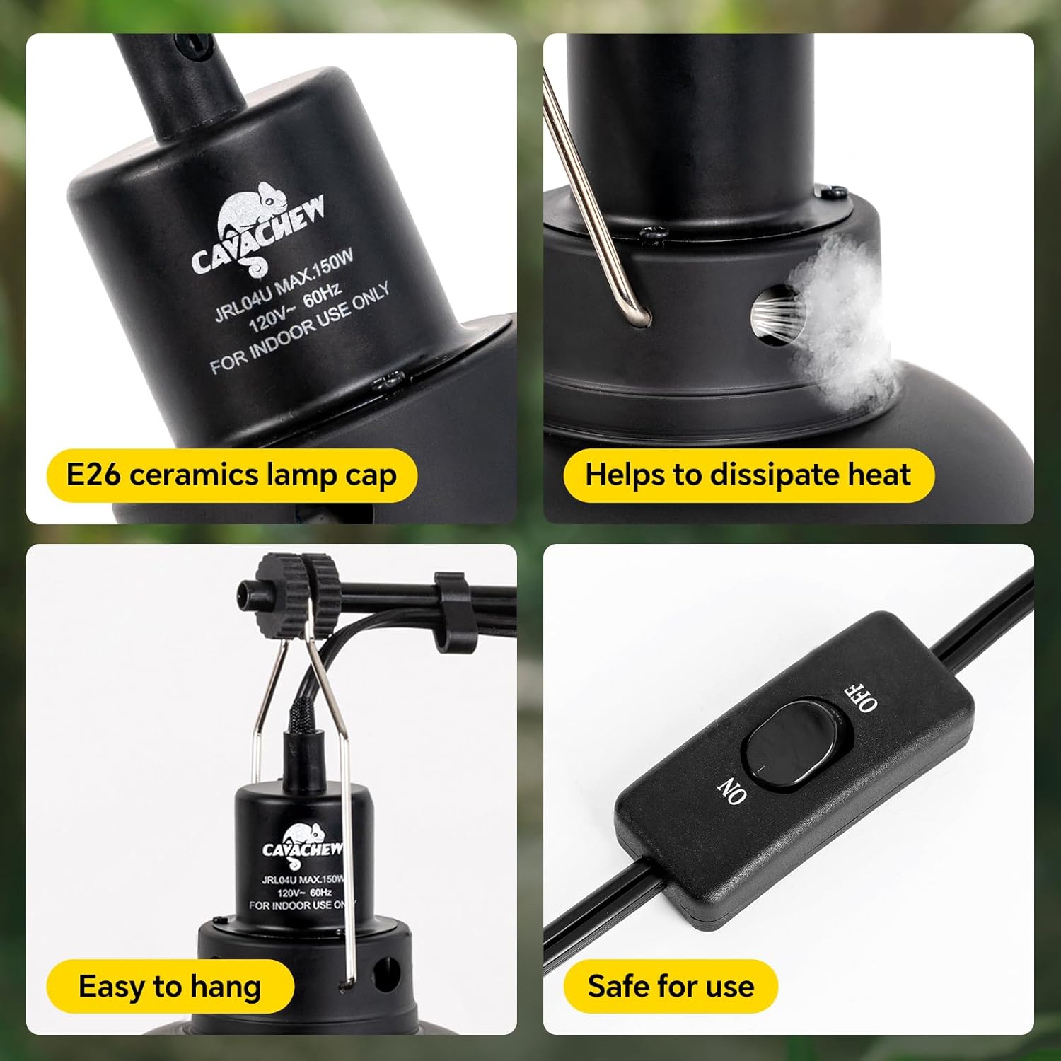 • Easy & Safe for Use: CAVACHEW reptile heat lamp fixture uses independent switches and hooks, easy to install and safe for use. Equipped with heat dissipation holes, which can extend the service life of the bulb.