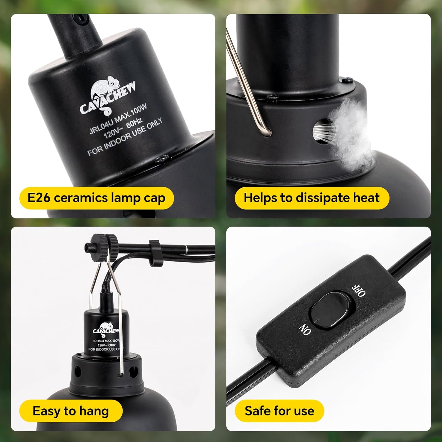 • Easy & Safe for Use: CAVACHEW reptile heat lamp fixture uses independent switches and hooks, easy to install and safe for use. Equipped with heat dissipation holes, which can extend the service life of the bulb.