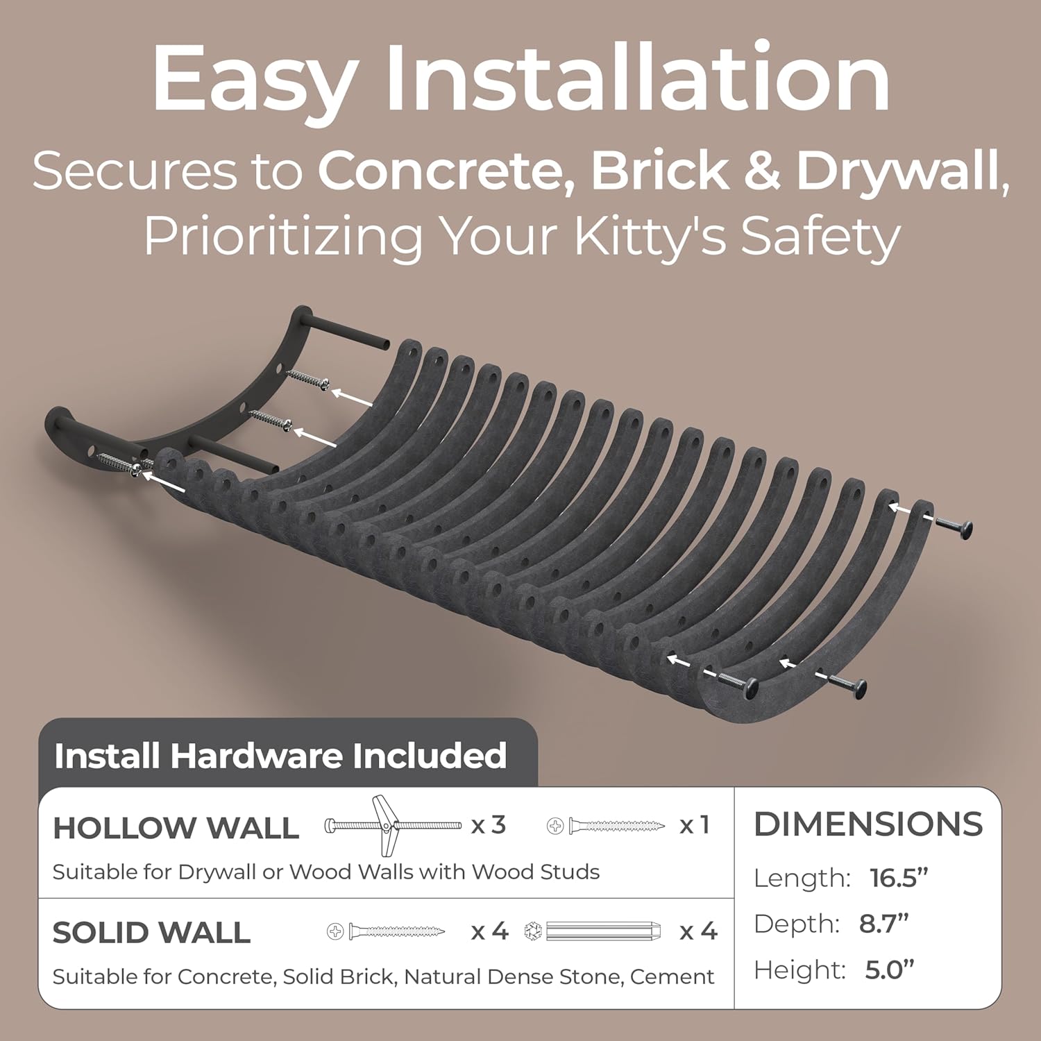 • Effortless Paradise: This cat hammock and wall bed includes all installation hardware, allowing your fur-baby to start exploring right away. Our cat climbing shelf securely attaches to concrete, cement, brick, dry wall and more ensuring your cat’s safety.
