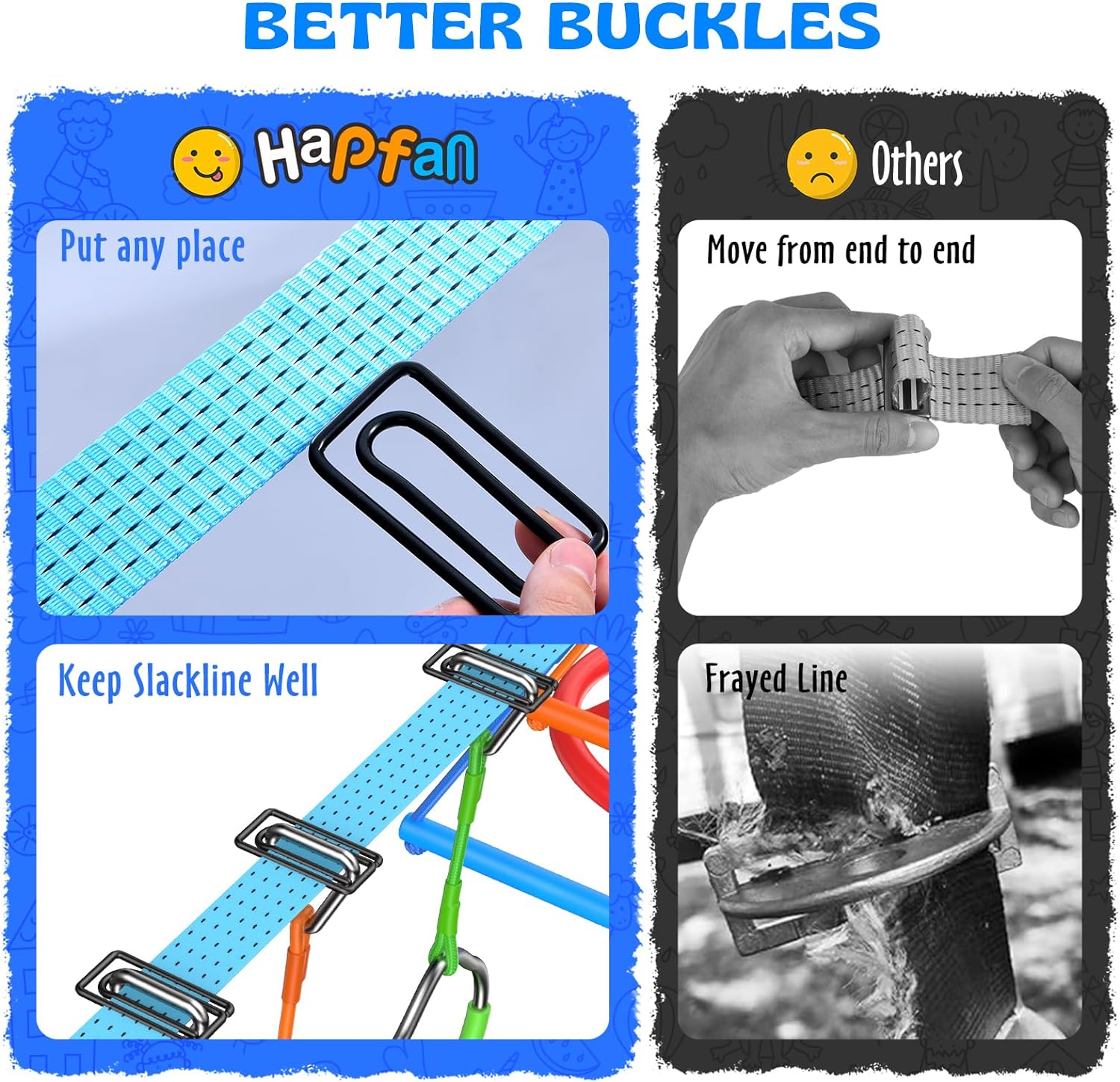 • 【Newly Designed Buckle】Hapfan unique buckle set ensures a quicker setup and enhanced safety without any fraying of the slackline. Easily costomize your own course by adjusting the distance and order of obstacles