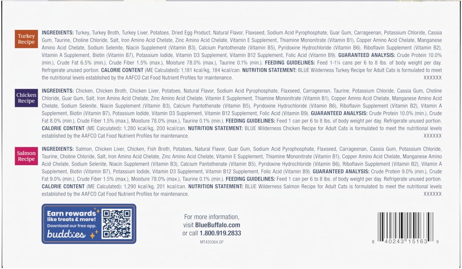 • Contains Twenty-four (24) 5.5-oz cans of BLUE Wilderness High Protein, Natural Adult Pate Wet Cat Food, Chicken, Salmon, Turkey