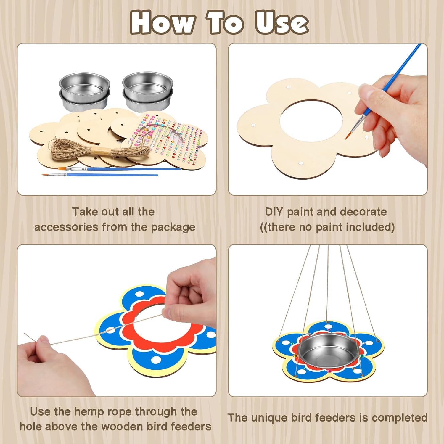 • Wooden Bird Feeders Kit: The bird feeders for Kids package includes 4 xunfinished wooden bird feeders, 4 xstainless steel bowls, 2 xpainting brushes( There no paint included), 1x10m hemp rope 1x rhinestone stickers 1x instruction. Fully equipped, kids can play freely and create their own artwork!Fun and creative crafts keep them busy and enjoy the handcraft entertained.let their creativity run wild!