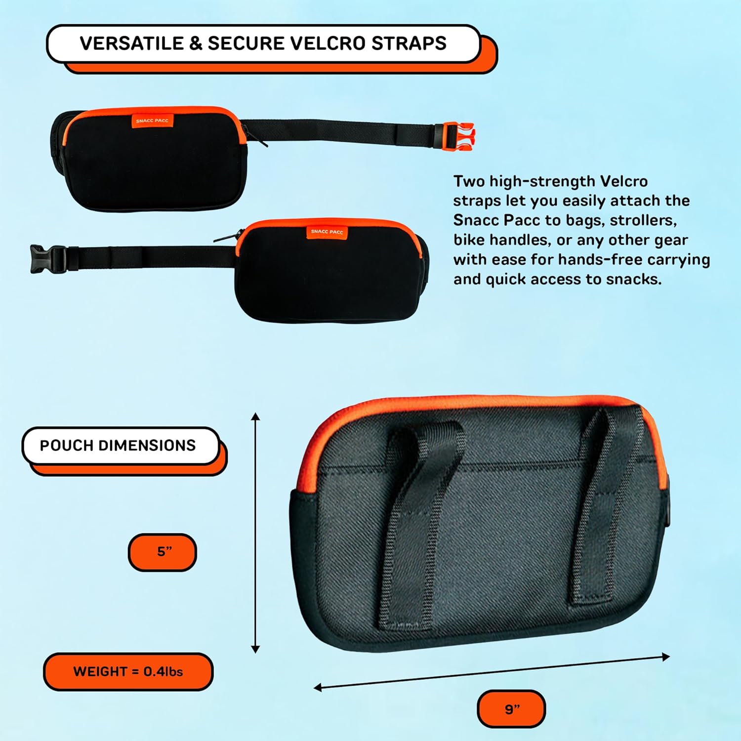 • TWO PREMIUM QUALITY POUCHES: The Snacc Pacc consists of two neoprene storage compartments. Each is equipped with Velcro strap backing.