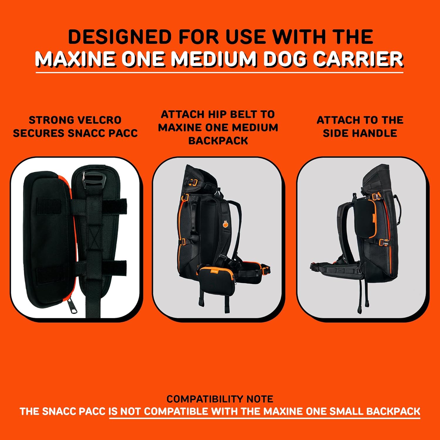 • IMPORTANT, PLEASE NOTE: The Snacc Pacc pouches are only compatible with the Medium Maxine One Backpack. It will not fit the small backpack.