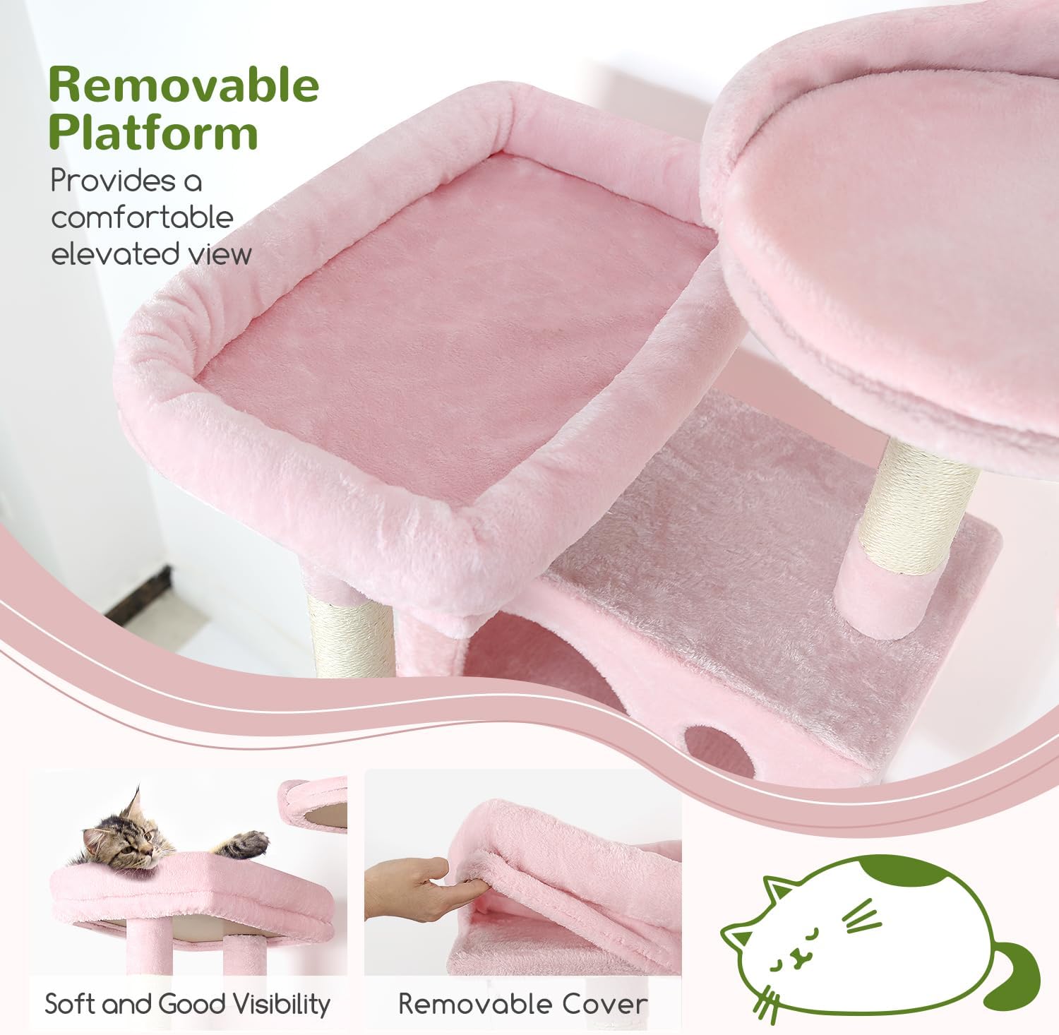 • CREATIVE SISAL ROPE: The pink cat tower addition of the small flower disc enhances the dangling effect of the sisal rope on this cat condo for indoor cats. Additionally, when lightly swayed or touched by the cat, the rope starts to create a dynamic effect similar to that of a pendulum. This dynamic and visually stimulating feature captures the curiosity and interest of cats, increasing playfulness and interaction