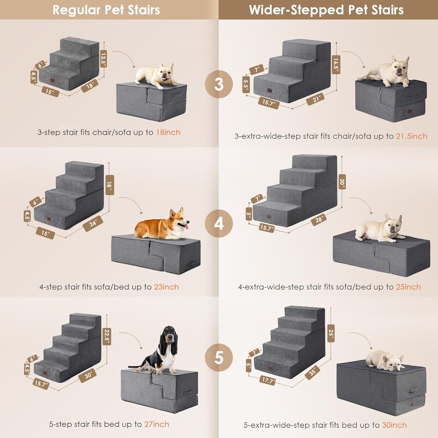 • MULTIPLE STEP SIZES - This dog stair comes in 3, 4, and 5-step options. Our 3-step pet stair is ideal for sofas and low beds (up to 18 inches high), while the 5-step version is better suited for higher beds (up to 27 inches). If your bed is of medium height (up to 23 inches), please select the 4-step one.