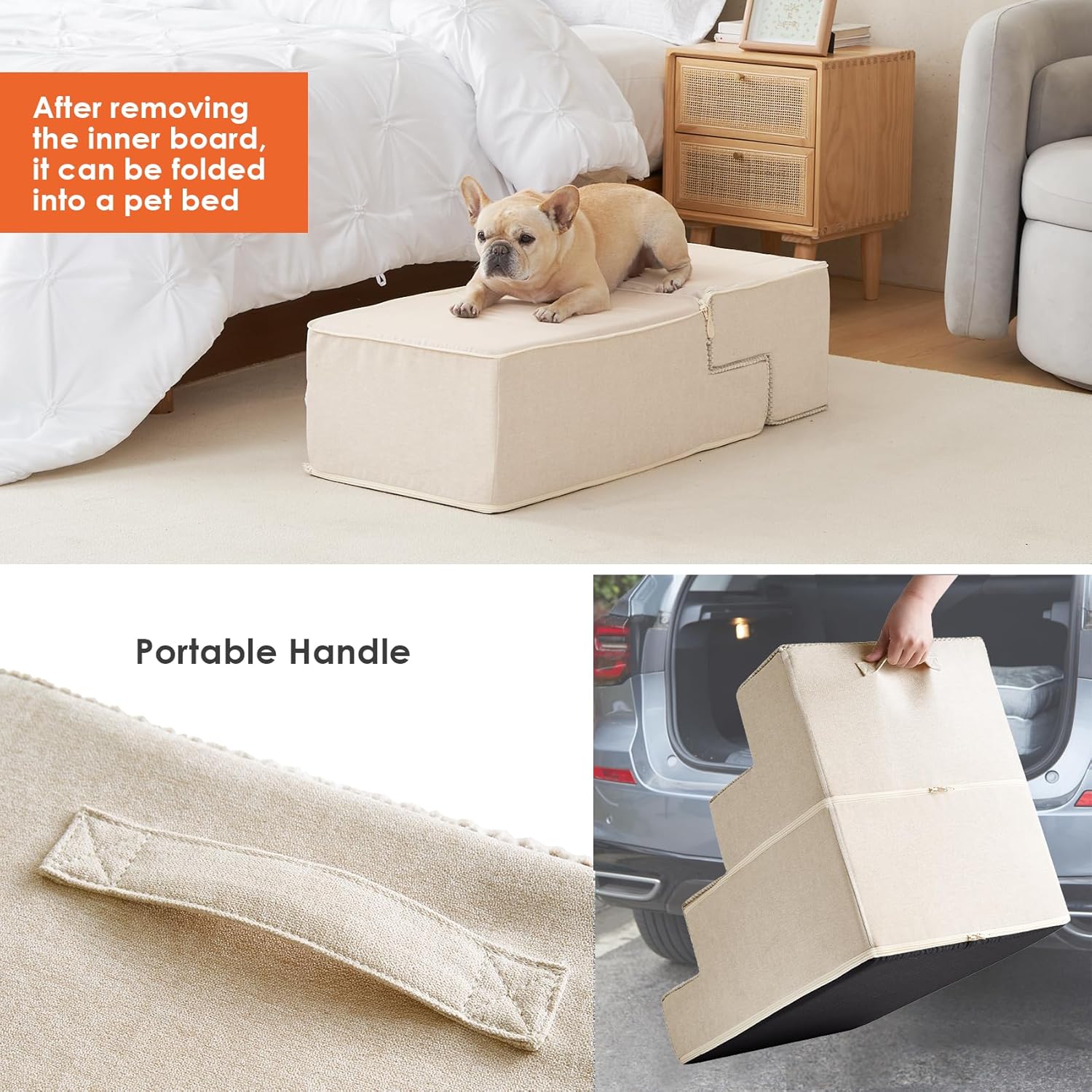 • STEADY & FOLDABE: With a 30D high density foam and eco-friendly support board, this dog stair offers enhanced stability. It can also be folded into a basic dog bed for your furry puppy to sleep.