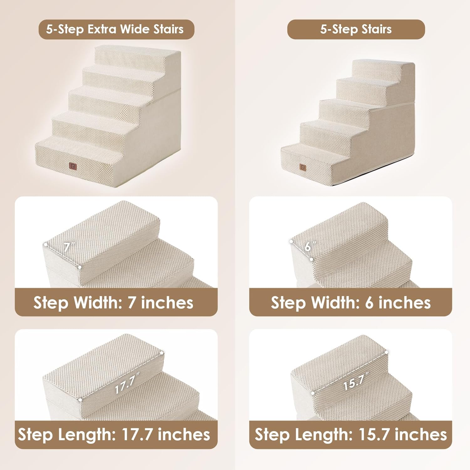 • MULTIPLE STEP SIZES - This dog stair comes in 3, 4, and 5-step options. Our 3-step pet stair is ideal for sofas and low beds (up to 18 inches high), while the 5-step version is better suited for higher beds (up to 27 inches). If your bed is of medium height (up to 23 inches), please select the 4-step one.