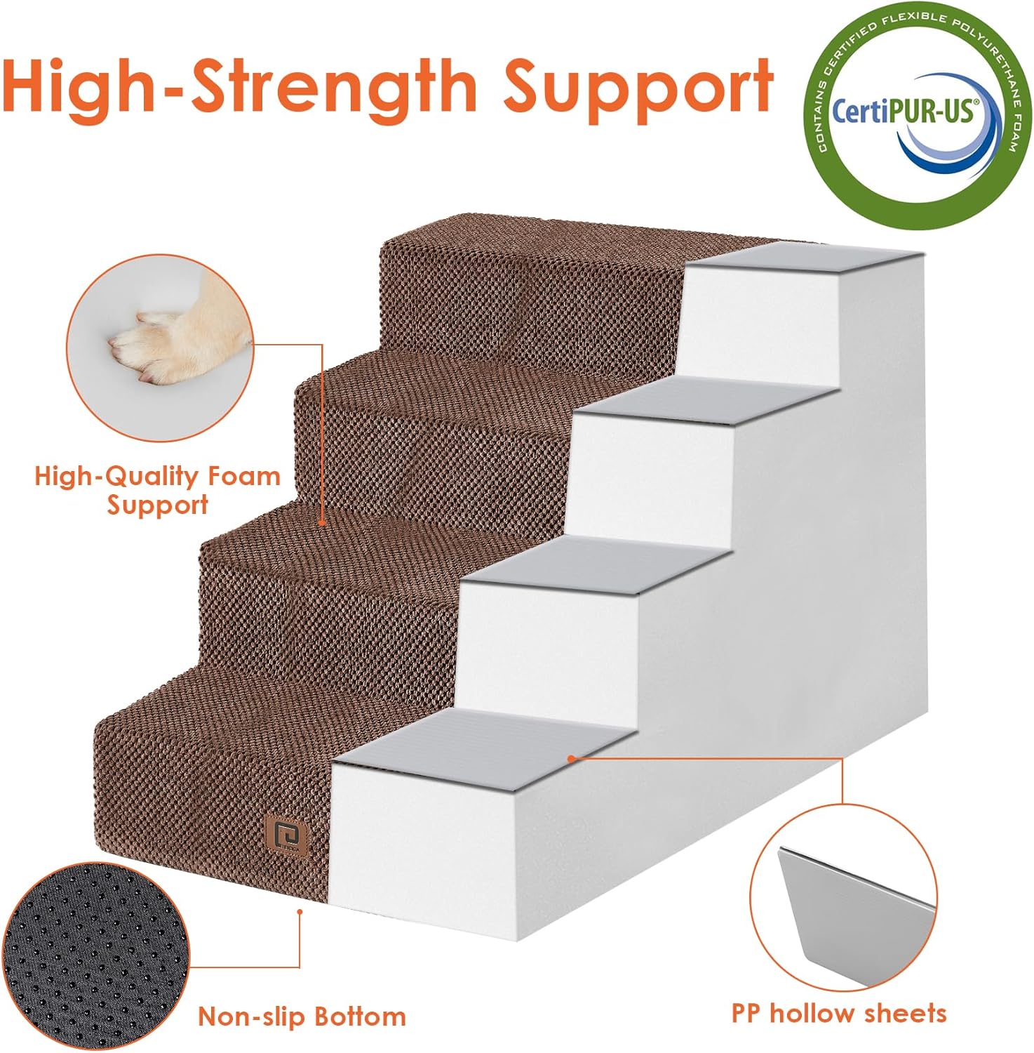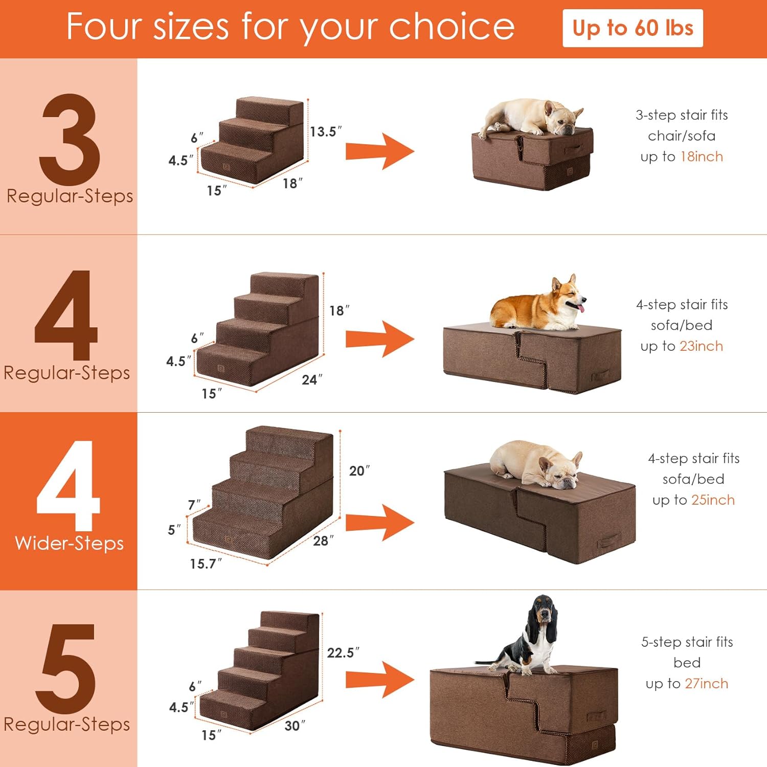 • MULTIPLE STEP SIZES - This dog stair comes in 3, 4, and 5-step options. Our 3-step pet stair is ideal for sofas and low beds (up to 18 inches high), while the 5-step version is better suited for higher beds (up to 27 inches). If your bed is of medium height (up to 23 inches), please select the 4-step one.