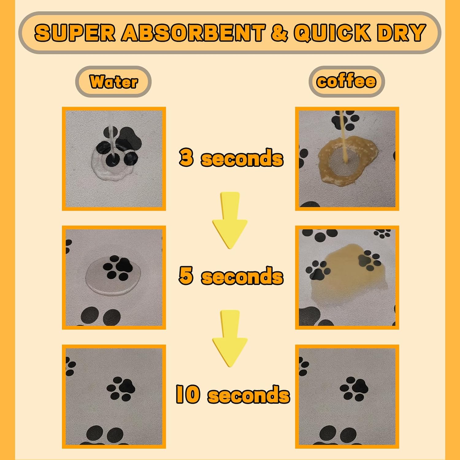 • HIGH ABSORPTIVENESS: The pet feeding mat is made of diatomaceous earth, which ensures fast water absorption and keeps the mat surface and floor dry and tidy. The super absorbency makes the feeding mat dry quickly, so even pets who love to drink water won't get their paws and floors wet