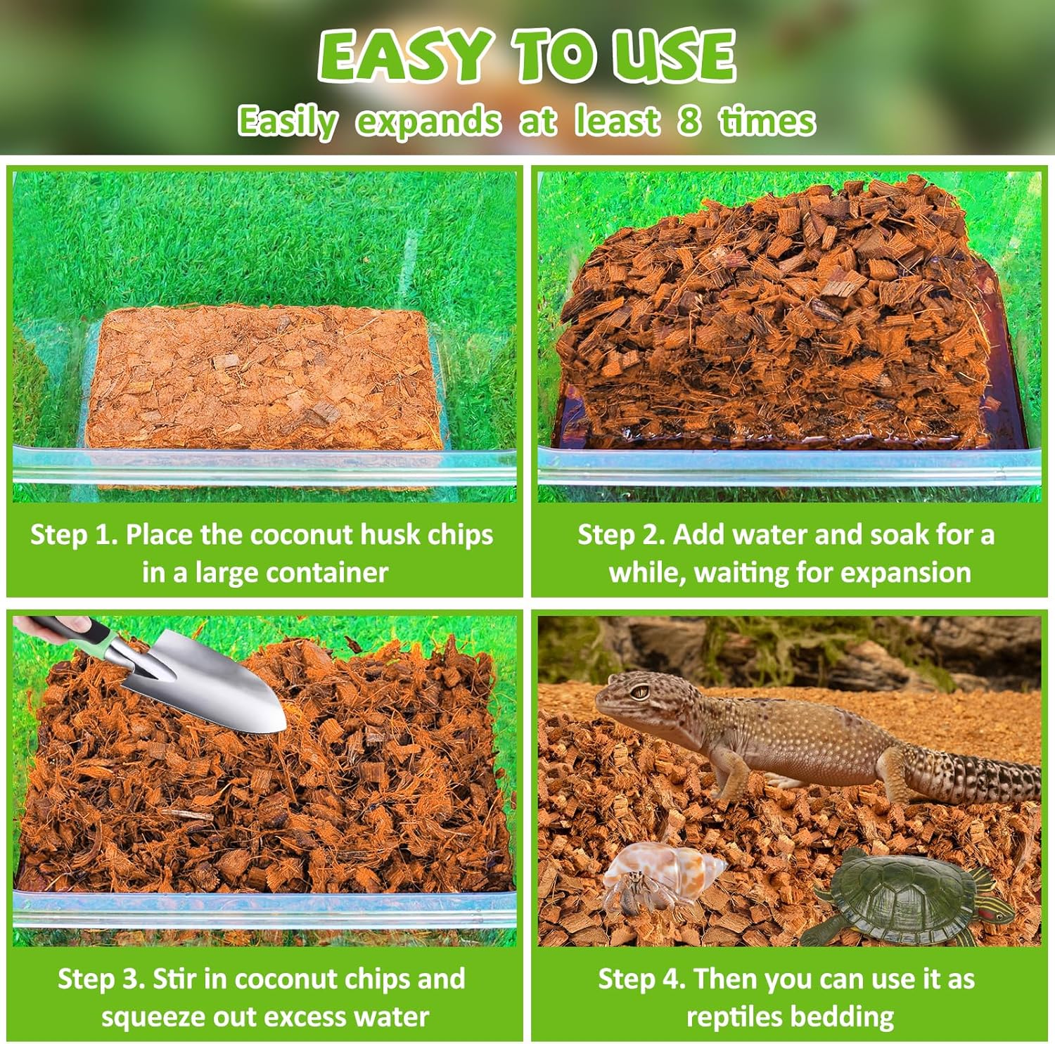 • Coconut Chip Substrate for Reptiles: You will receive 4 pack coconut husk chips substrate, ideal for all tropical reptiles bedding; The superb humidity retention and waste absorbent make snakes and ball pythons enclosures more comfortable and safer to live in, which also adds to the natural look in reptiles terrarium and tanks; Each brick is 8.2*4.1*2.2 inches, weight: 1.1 lb/pack