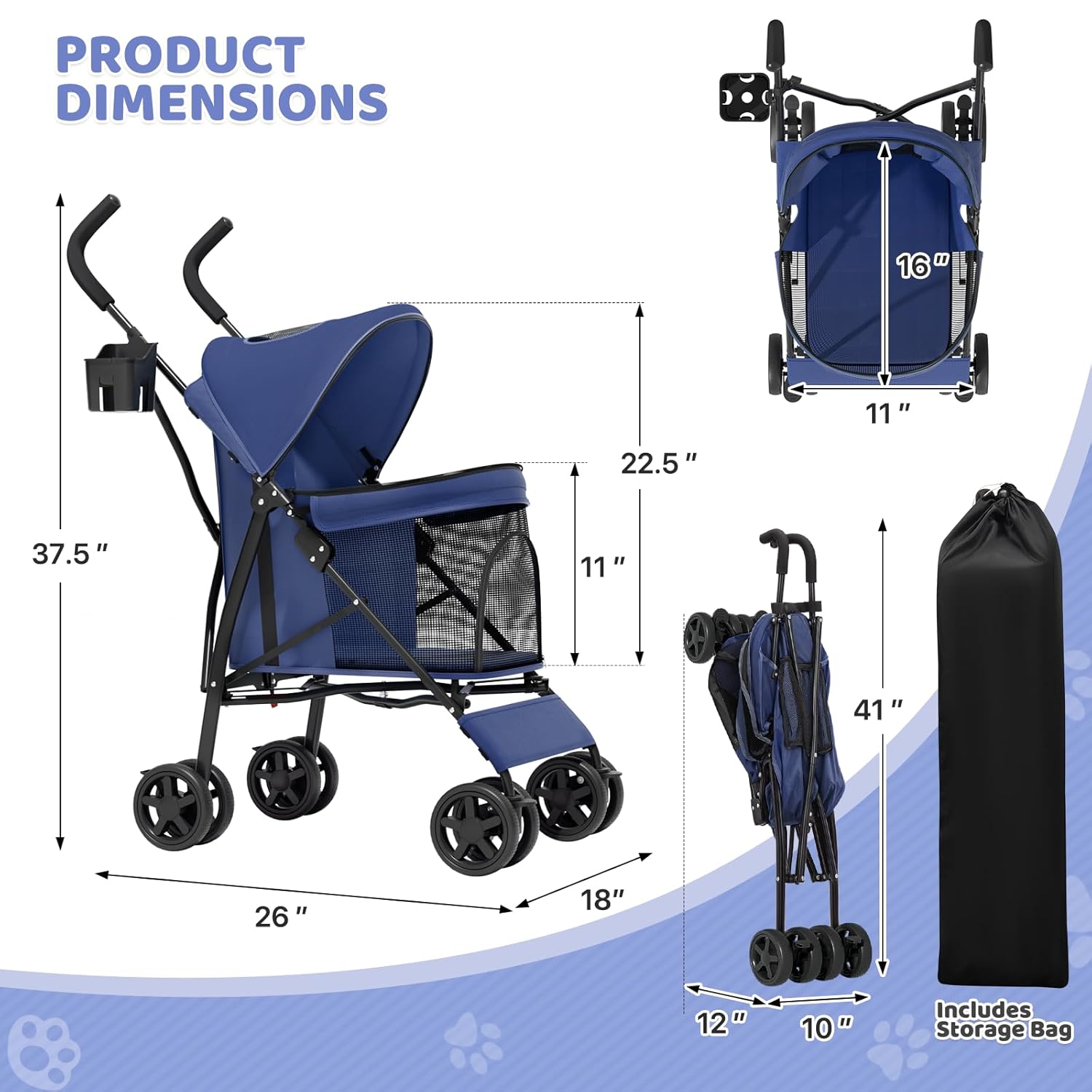 Magshion Compact Pet Stroller for Small-Medium Dogs/Cats up to 22lbs, 4-Wheel Lightweight Umbrella Shaped Portable Puppy Travel Jogger with Breathable Mesh, Cup Holder & Rear Storage, Navy Blue