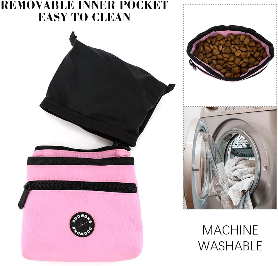 • REMOVABLE DESIGN: This small dog treat bag has a ring of zip on the inside and the lining is completely removable - no more worries about the dog food dirtying the bag and difficult to clean! Just gently unzip the inner zip, the inner pocket can be completely removed and hand washed or thrown directly into the washing machine for cleaning. Let your fury friends always enjoy clean and fresh treats!