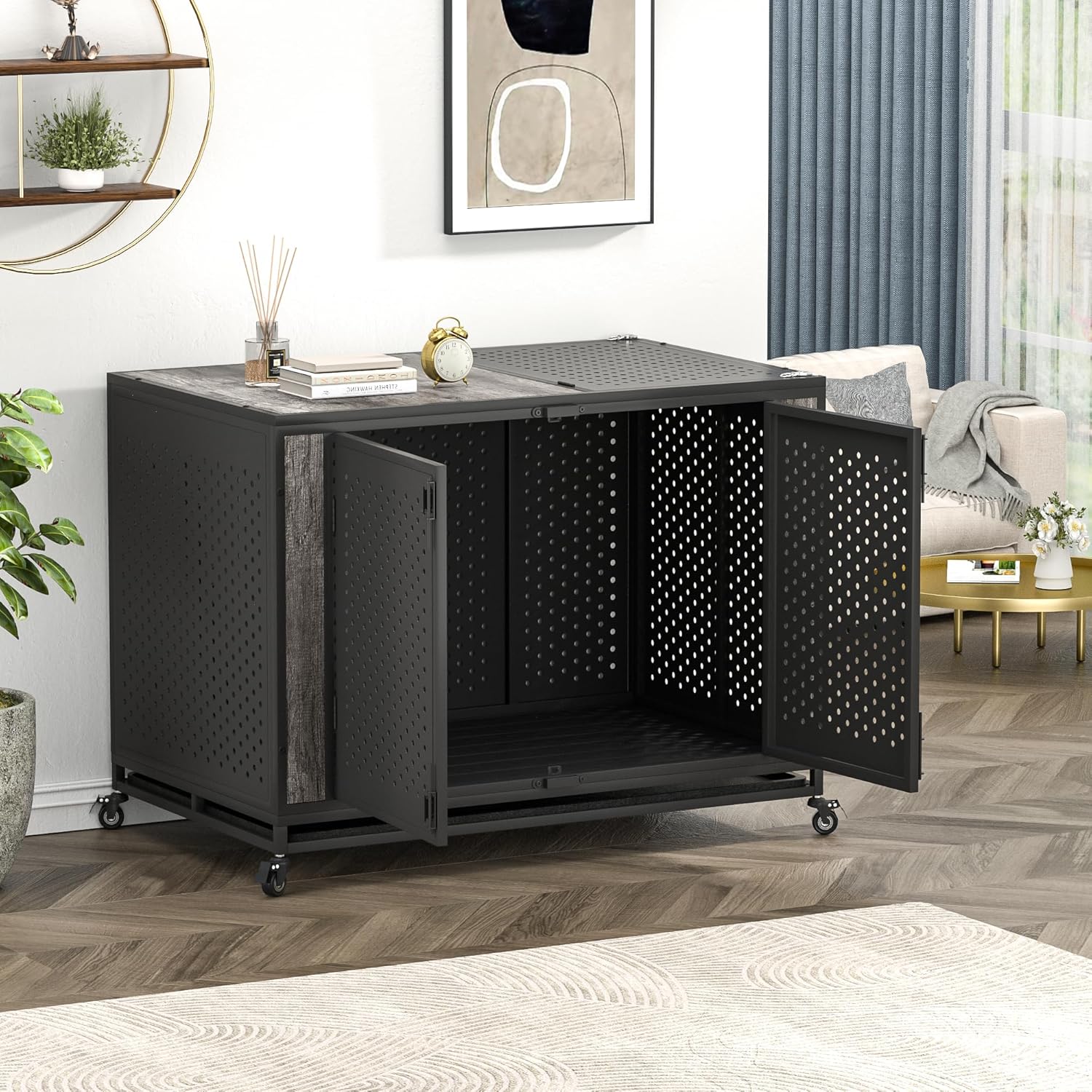 • [Washable Tray and Lockable Wheels] The dog cage comes with an entire washable plastic pan that simplifies the cleaning process. Additionally, the lockable wheels provide the flexibility to position the crate wherever needed with ease.