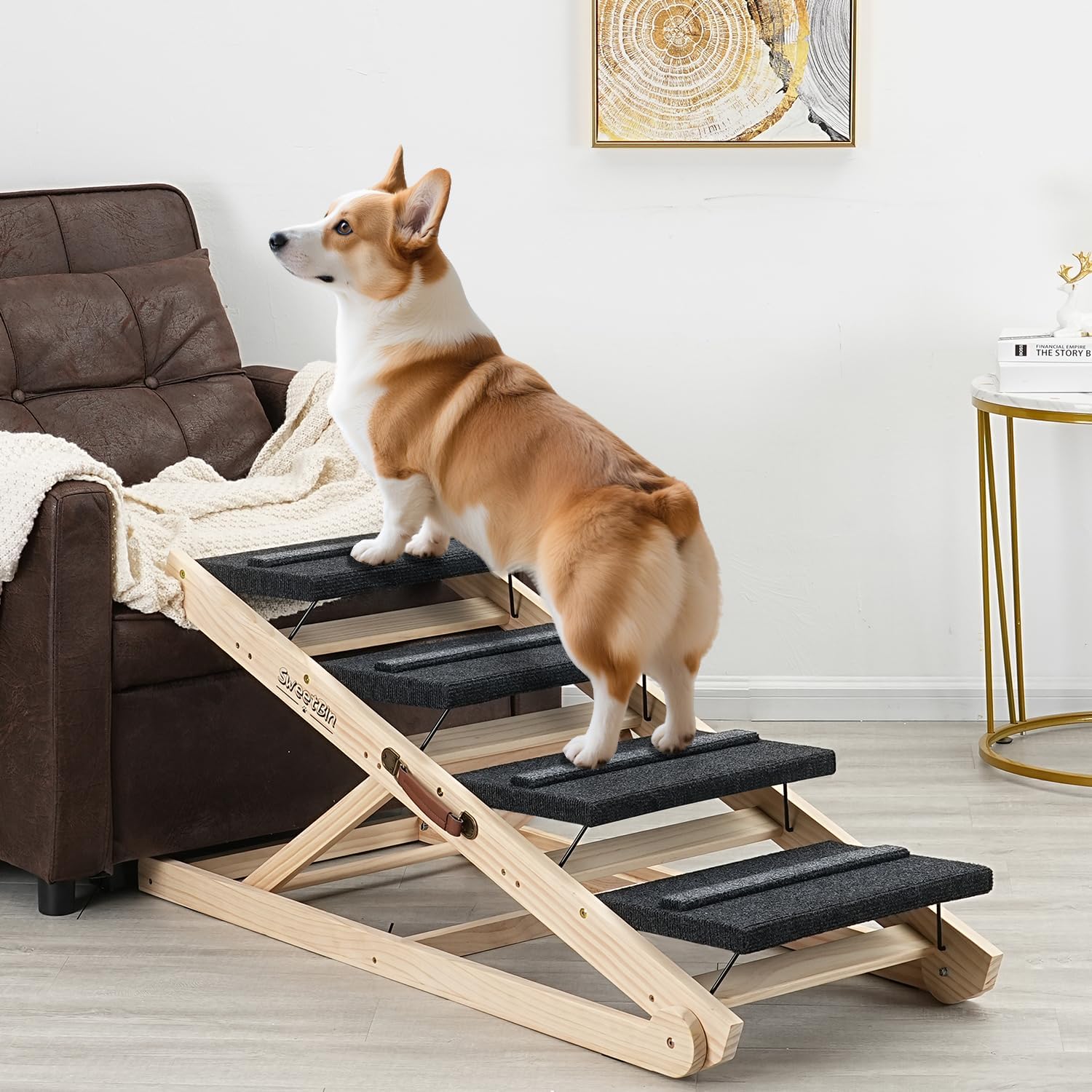 • ✅ANTI-SLIP SAFETY FEATURES - Our wooden dog ramps are thoughtfully crafted to alleviate muscle and joint strain. The non-slip fabric cover provides traction for pets' paws, with 4 anti-slip crossbars preventing sliding on inclines. Designed with bottom anti-slip pads, our pet steps offer protection for your floors.