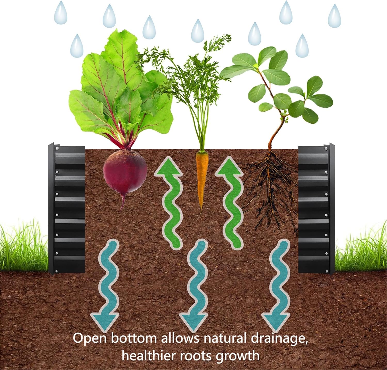 • OPEN BOTTOM: Sits on the ground garden bed, allows natural drainage, prevent waterlogging and root rot. It encourages the plants’ roots to grow deep into the ground, promoting stronger and healthier plants.