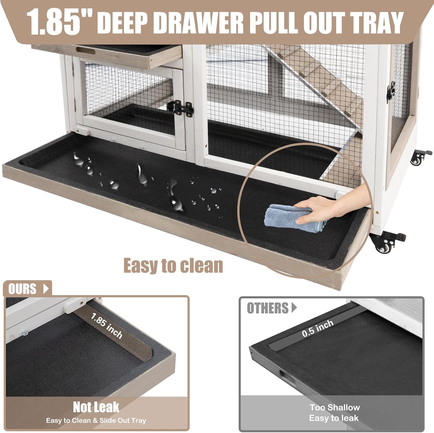 Rabbit Hutch Indoor 40" L Large 2 Story Outdoor Wooden Bunny Hutch with Run, 4 Metal Wheels & 2 Deeper Trays, UV-Proof Panel Rabbit Cage Guinea Pig Pet House for Small-Medium Animals