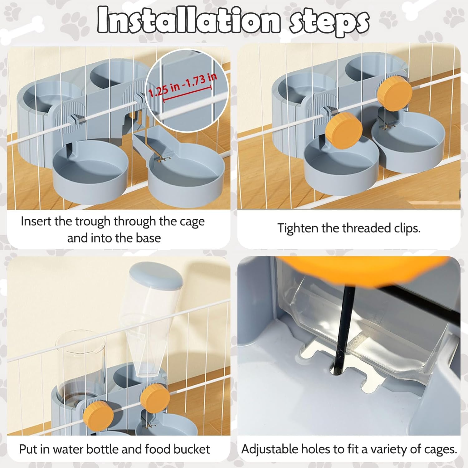 • Tip : The bunny water dispenser is suitable for cages with wire clearance of 3.2 cm (1.25 inches) - 4.4 cm (1.73 inches), please measure the wire clearance carefully before purchasing to ensure that the pet feeder can be installed and used properly