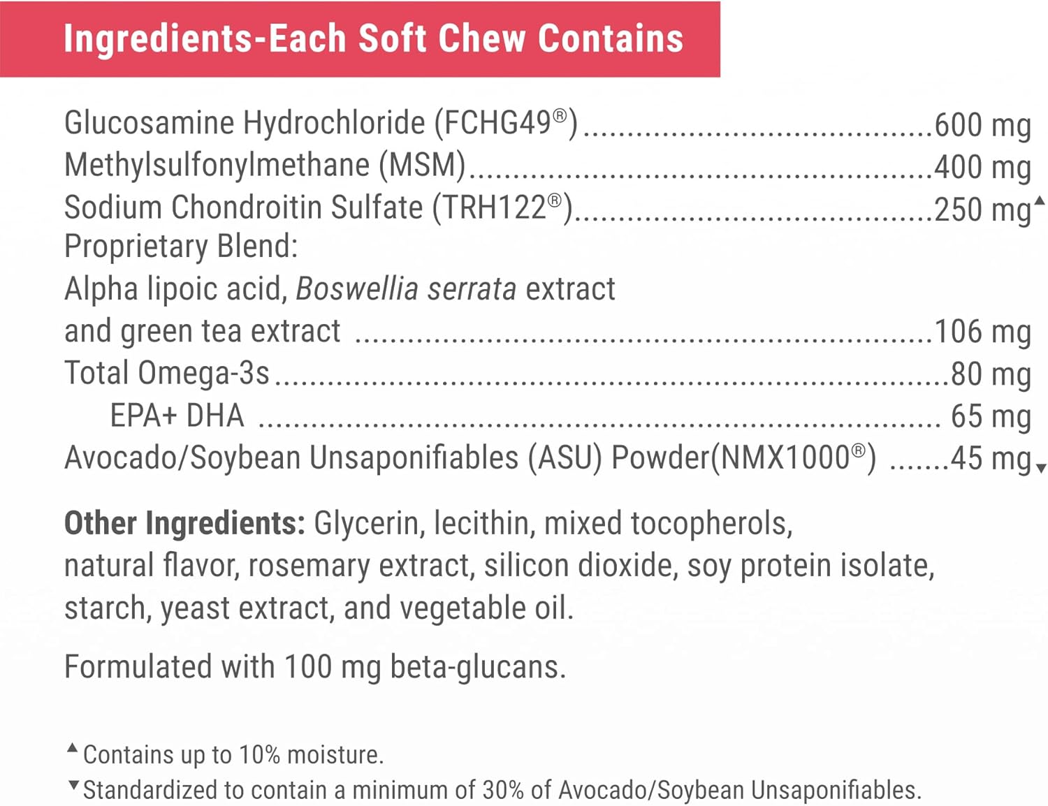 • Omega-3 Fatty Acids and Beta-Glucans: Each soft chew contains omega-3 fatty acids to help support skin and coat health and beta-glucans for immune support